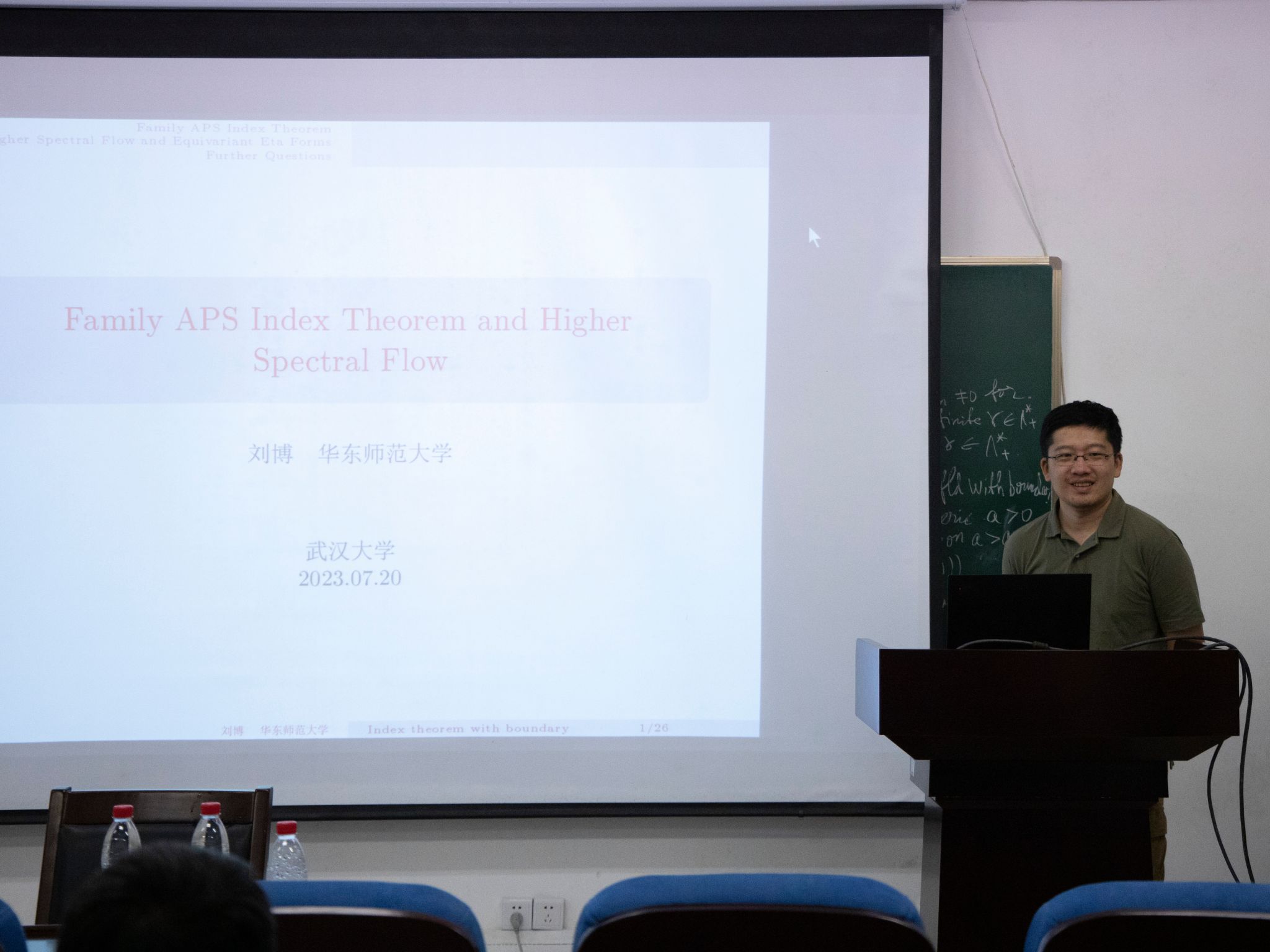刘博教授首先展示了Atiyah-Patodi-Singer(APS)指标定理的发展历程。刘教授介绍了著名的Atiyah-Singer指标定理,以及Atiyah-Patodi-Singer建立的带边流形指标定理。其后,刘教授讨论了Bismut-Cheeger和 Melrose-Piazza如何将APS指标定理推广到了一簇流形的情形。在边界项上,这里会出现一个带扰动的eta形式。接着,刘博教授介绍了他在这一领域的最新研究进展,他将eta形式推广到了纤维上有紧Lie群作用的等变情形,并利用Dai-Zhang的高维光谱流研究了这些eta形式的几何性质。最后,刘博教授讨论了关于带边指标定理的其它相关问题,其中包括了他与麻小南教授合作得到eta不变量的局部化问题。