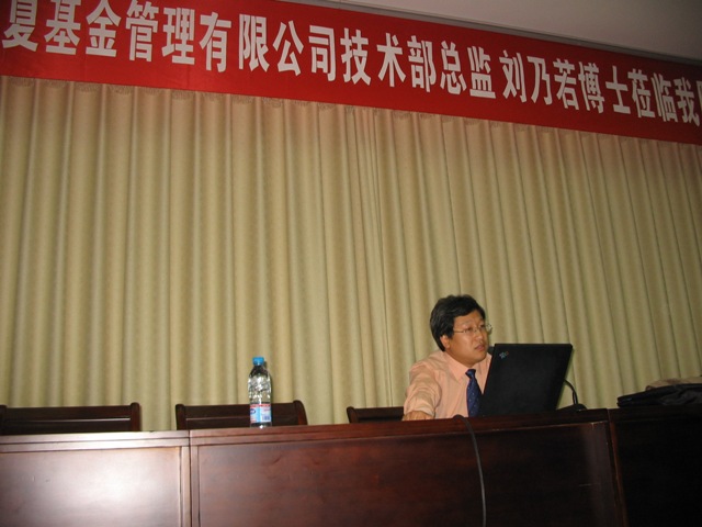 刘博士首先对华夏基金公司结构、成长历史、成员等方面作了简要介绍,并对在座的同学来华夏基金工作实习表示欢迎。刘博士接着畅谈了同学们较为关心实习的内容及华夏基金目前在各个部门紧缺的人才种类。据介绍,华夏基金管理有限公司成立于1998年4月,是经中国证监会批准成立的首批全国性基金管理公司之一,现在管理资金规模已超过2000亿,成为我国基金公司中管理资金超过2000亿的三家公司之一。在接下来是有关基金方面的知识问题抢答中,在场的同学积极参与,流利的回答甚至让主持人自叹标准答案都没有那么详细。