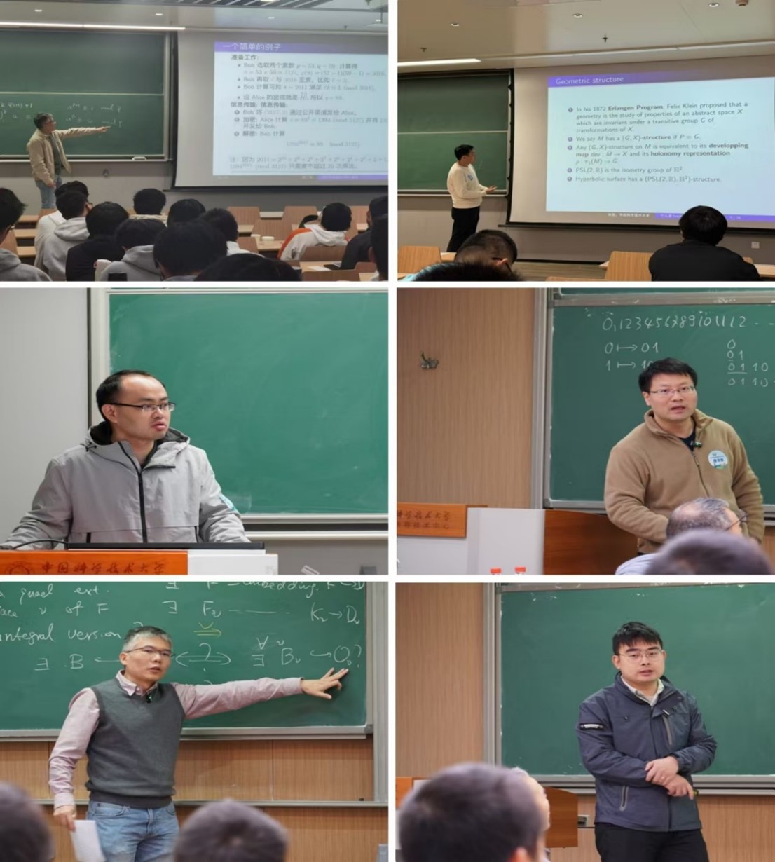 会上,两校的多位杰出学者进行了分享报告。武汉大学薛江维教授作《非对称加密与RSA算法》报告。中国科学技术大学孙哲教授作《什么是Teichmuller空间》报告。缪爽教授作《Well-posedness for fluid free boundary problems in general relativity》报告。武汉大学廖灵敏教授作《Normal numbers and multiple ergodic averages》报告。武汉大学王好武教授作《Singular automorphic products and Lie algebras》报告。薛江维教授作《Divisibility of class or type numbers of totally definite quaternion orders and selectivity》报告。