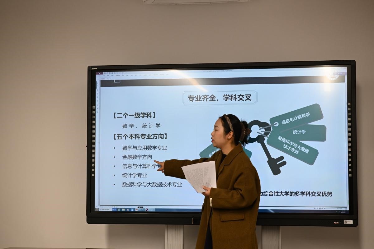 我院学工办主任胡法拉介绍武汉大学数学与统计学院学生工作的整体情况。她回顾了学院发展历程,介绍学院设有数学、统计学两个一级学科,涵盖五个本科专业方向,并通过中法数学班、数学自强班等特色项目,培养国际化、拔尖创新人才。她还介绍了学院在学科竞赛、科研训练、党建思政等方面取得的成果,展现了学院在思想引领、学风建设、国际交流等领域的全面布局与特色实践。