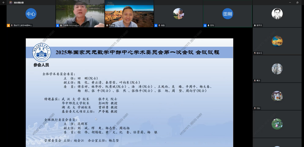 4月8日,国家天元数学中部中心(以下简称中心)新一届学术委员会首次会议以线上形式举行。会议由中国科学院院士、中心学术委员会主任田刚主持。会议邀请中国科学院院士、武汉大学校长张平文、国家自然科学基金委天元项目主任严夺魁出席。来自北京大学、南开大学、浙江大学、中国科学技术大学、中国科学院数学与系统科学研究院、吉林大学、山东大学、湘潭大学、北京师范大学、复旦大学、河北师范大学、湖北大学、华中科技大学、华中师范大学、南京大学、四川大学、天津大学、武汉大学、西南财经大学、郑州大学等单位的中心学术委员会、执行委员会及管理委员会成员参加会议。