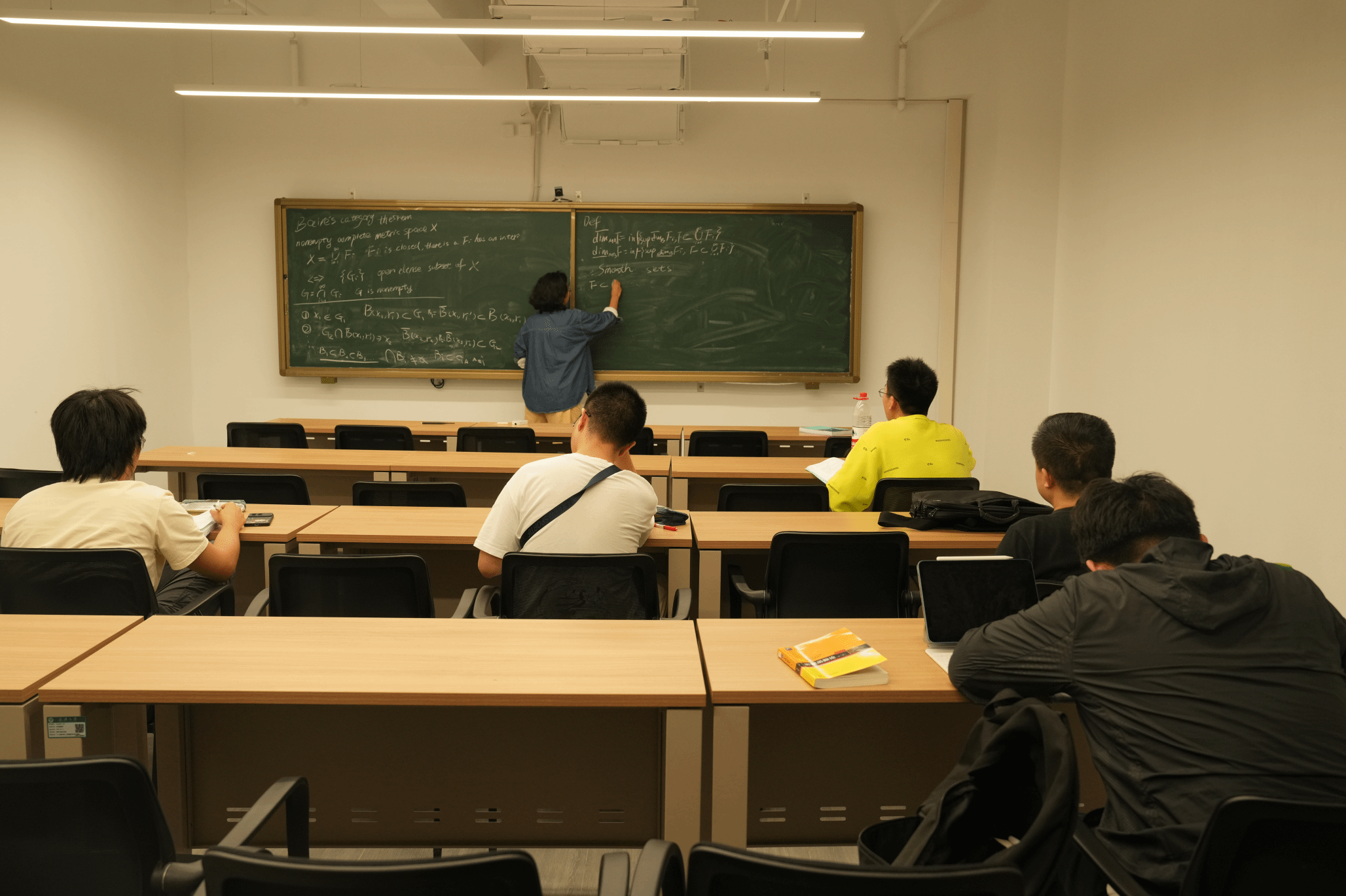第二次讨论班,2024级信息与计算科学(自强班)的林志宇同学担任主讲。他系统性地阐述了盒维数的定义及其多种等价形式。在廖灵敏等老师的悉心指导下,林志宇同学对书本上的关键命题进行了严格的数学证明,并结合 Middle Third Cantor Set、Sierpinski Triangle 等经典案例,加深了同学们对盒维数概念的理解深度。这一环节不仅夯实了我们的理论知识基础,更有效锻炼了我们严谨的数学表达能力,培养了我们科学的逻辑论证思维,为后续深入研究奠定了坚实的基础。