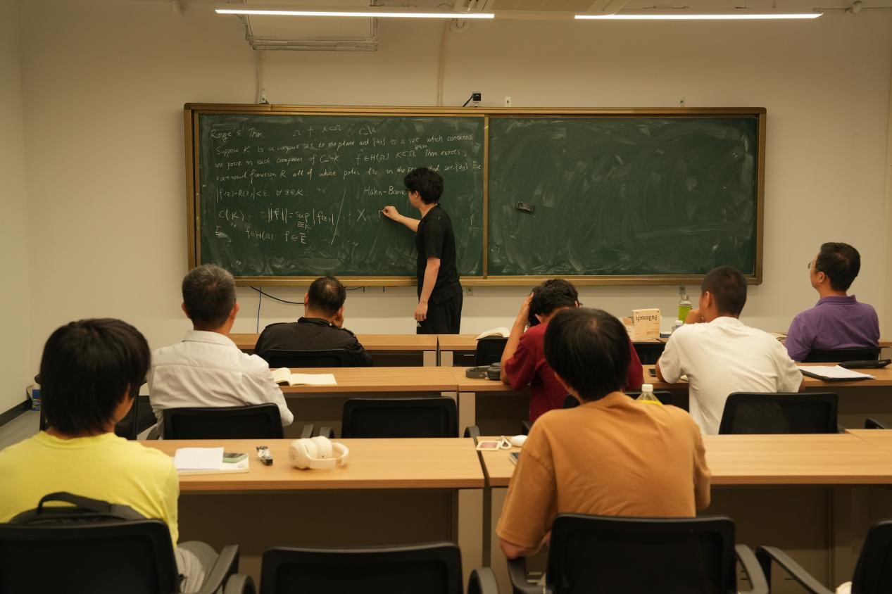 复分析讨论班已圆满举办七期,前三期由2023级数学与应用数学自强班本科生喻乐源同学主讲,后四期则由2023级数学与应用数学自强班本科生喻乐源和方子衿两位同学共同主讲。前期讲座中,喻乐源同学以规范严谨的逻辑梳理了因子分解定理的理论基础,深入系统地解析了Jensen公式,并对整函数零点分布的本质作了精彩阐述。同时,讨论班聚焦复平面上的Weierstrass因子分解定理,喻乐源同学以具象构造展示了其证明思路。张忠祥老师则在此基础上,基于存在性方法,将该定理推广至单连通域的普遍情形,理论阐释见解独到、启发性强。尤为突出的是,方子衿同学主动补充了张老师讲解中的细节问题,展现出学生团队间的协作与深入思考。