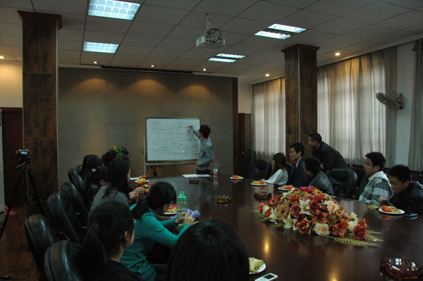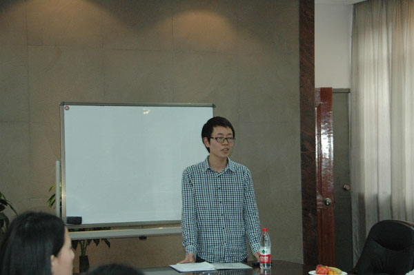 启动仪式结束后是研讨会部分。王涛同学从容走上讲台开始了他幽默风趣却又不失学术严肃性的报告,鉴于在座的大部分听众对于Boltzmann方程并不熟悉,王涛并不局限于方程的细节,而是从方程本身的发展历史、意义及近期学术界对Boltzmann方程所做的研究等方面做一些宏观的介绍,现场气氛热烈而轻松。面对冯慧副院长和吕锡亮老师有针对性的提问,王涛则应答自如,同学们也从王涛的解答中对Boltzmann方程有了更深入的了解。一个多小时的报告虽然很结束了,但给在场的研究生留下了深刻的印象,也从中受到了许多启发。