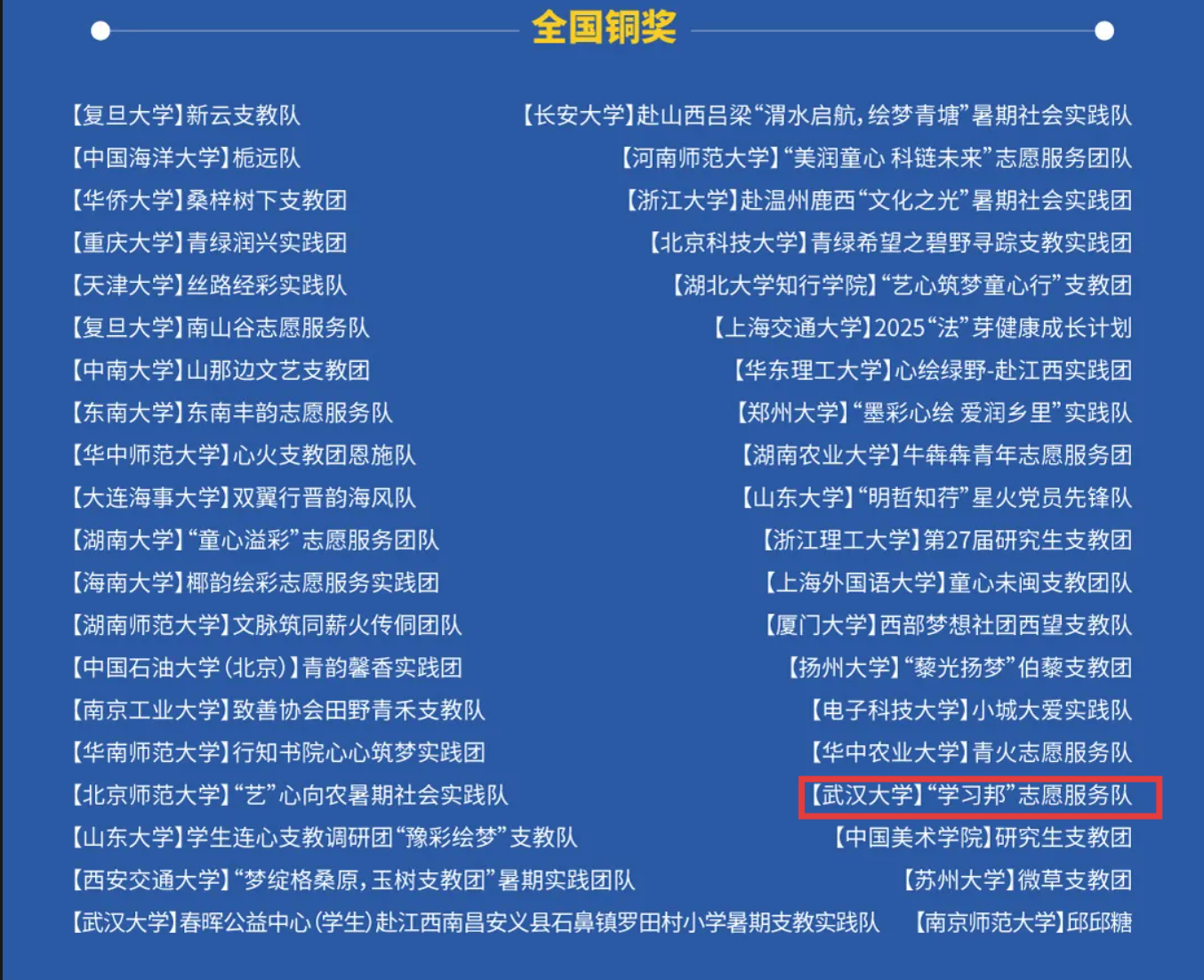青年志愿者协会旗下“学习邦”志愿服务队凭借扎实的支教实践、创新的课程体系与显著的服务成效,从全国209所高校的626支申报团队中脱颖而出,荣获全国铜奖,为学院志愿服务工作再添重磅荣誉。
