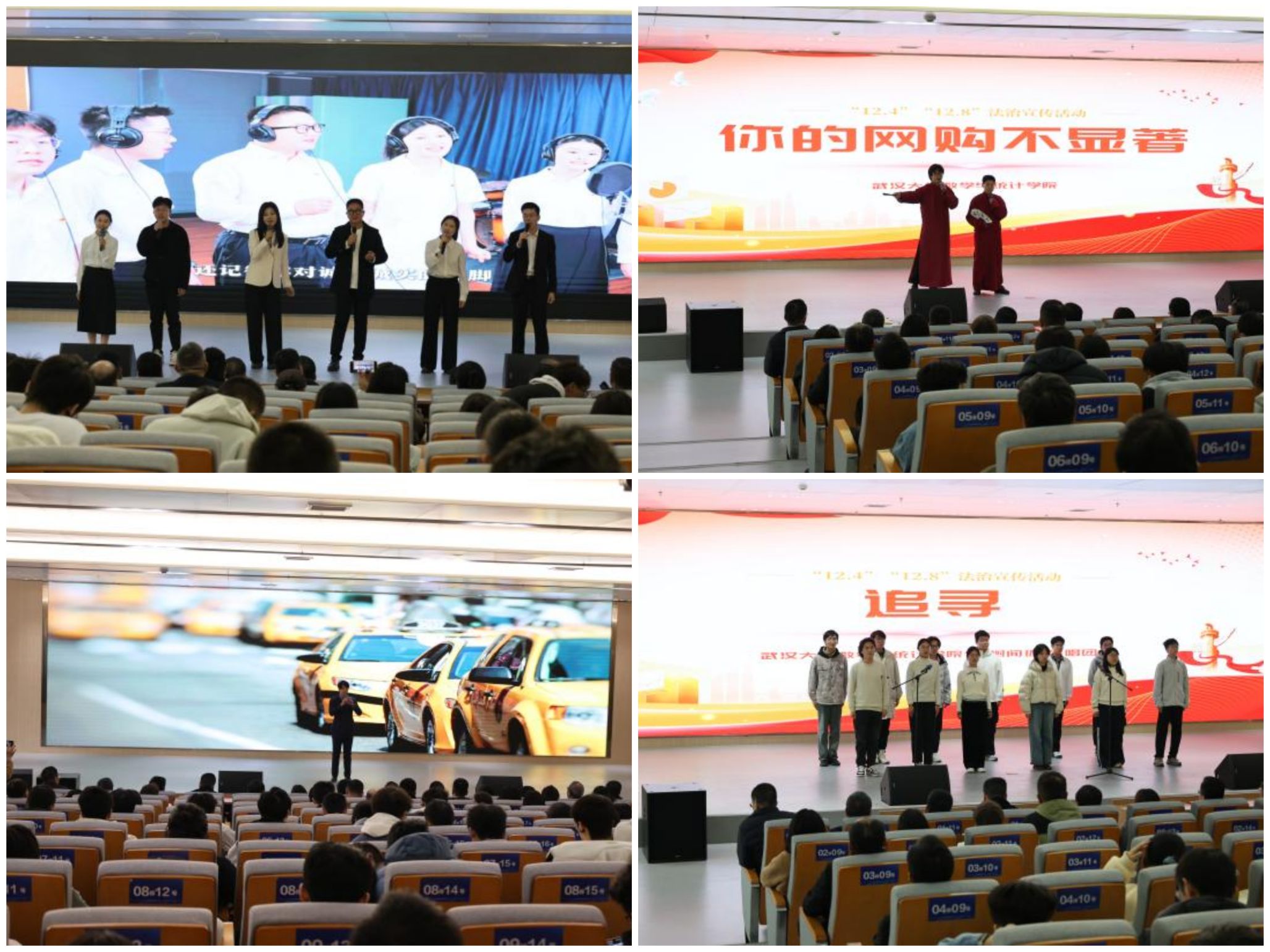 我院学子和各单位一同带来了精心编排的统计法治主题节目。从激昂高亢的城市赞歌《大城大梦》到轻快有趣的快板《“快”讲统计调查》,从展现湖北统计调查人青春风采的农普版《稻香》到铿锵有力的双人演讲《红蓝交响曲——当统计蓝遇见底线红》,从原创相声《你的网购不显著》到深情合唱《追寻》,艺术性与知识性在舞台上巧妙融合,生动展现了我院青年学子的蓬勃朝气与基层统计工作者的担当使命。