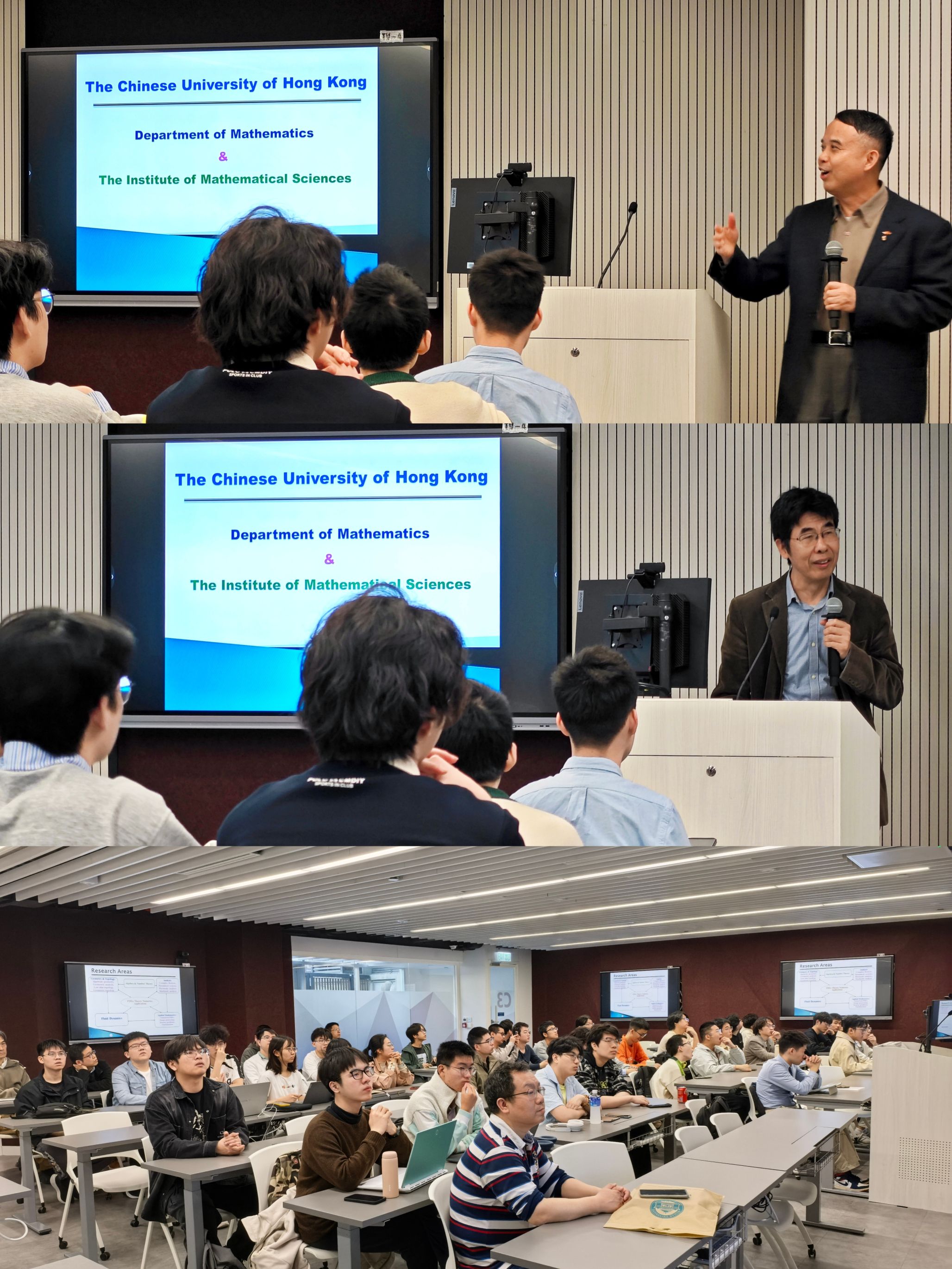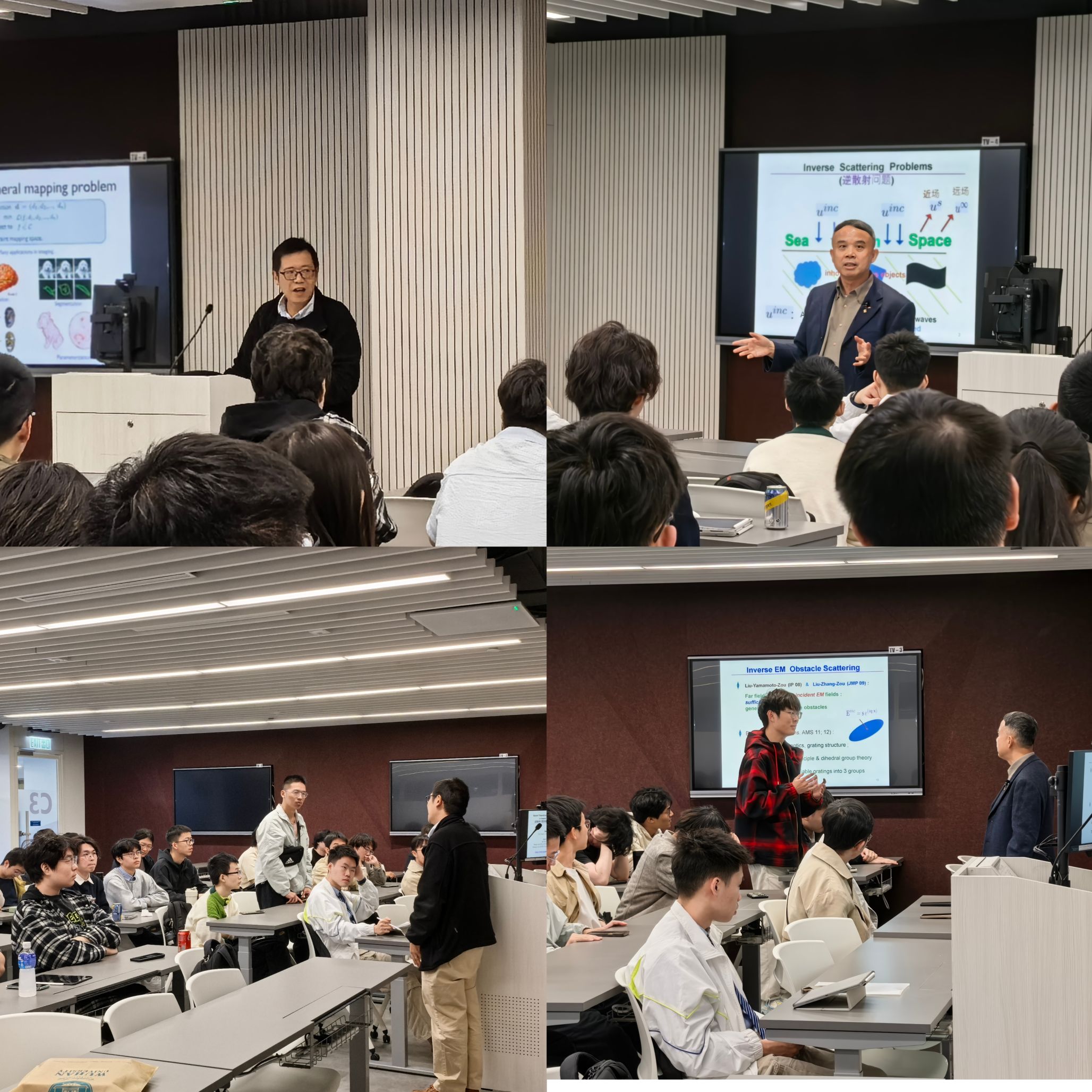 雷樂銘教授作题为《Quasiconformal Mappings and Constrained Mapping Problems》的学术报告。报告从约束映射问题出发,系统介绍了拟共形映射(Quasiconformal Mappings)的数学背景,并进一步展示了该理论在多个实际问题中的应用,包括大变形微分同胚配准、密度均衡映射以及折纸结构设计中的受限映射问题等。报告展示了几何分析方法在计算几何与图像处理等领域的重要应用。邹军教授作题为《Recent Theoretical & Numerical Developments in Inverse Scattering Problems》的报告。报告围绕反问题这一重要研究方向展开,介绍了该领域的理论背景与数值方法,并重点展示了香港中文大学在该领域近年来取得的重要研究成果。报告从理论分析与数值计算两个方面深入阐述了反问题在科学计算与工程应用中的重要意义�