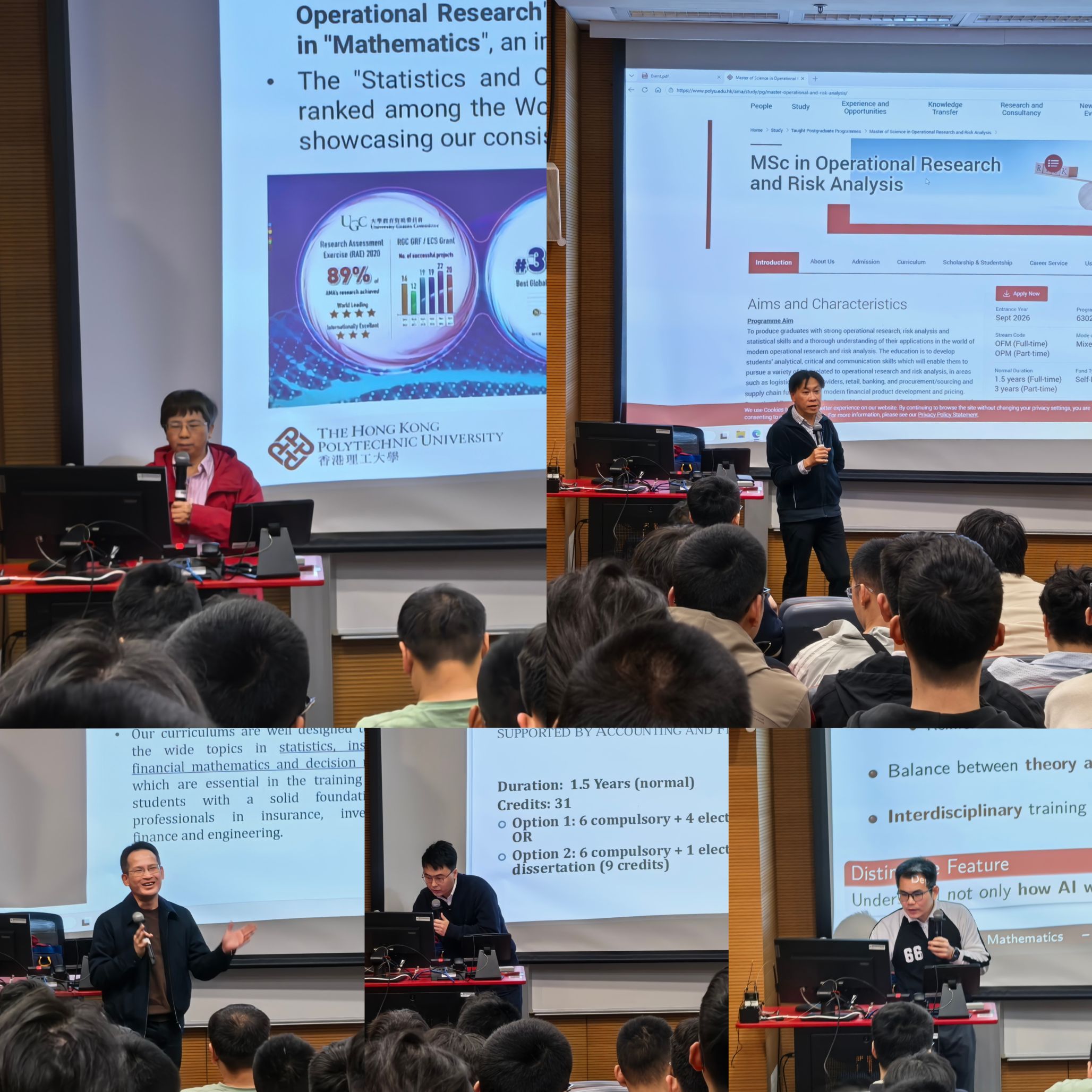 香港理工大学应用数学系副主任赵兴球教授首先代表香港理工大学及应用数学系致辞,对到场师生表示热烈欢迎,她详细介绍了香港理工大学的发展历程、校园特色及其在应用数学领域的卓越成就。此外,她重点介绍了应用数学系博士的招生要求和奖学金资助情况。楊翰強、姚嘉晖教授、蒋招立教授、张仕俊教授分别介绍了运筹及风险分析理学、精算与投资科学、量化金融与金融科技、数据科学与分析理学硕士项目,展示了学校国际化的培养模式以及广阔的学术平台�