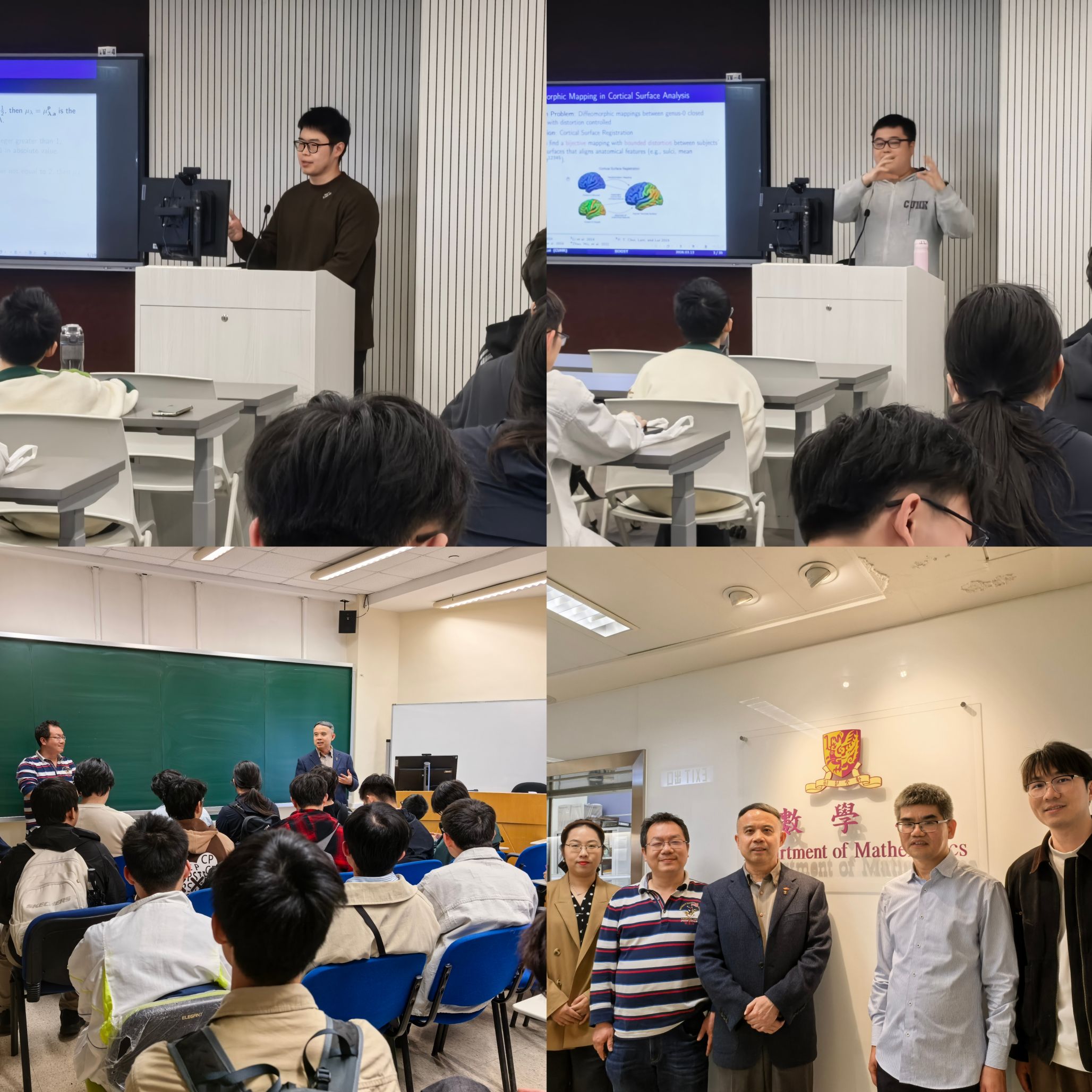 在学生报告环节,易天涵围绕《Homogeneous non-Rajchman self-similar measures on the line》,分享了自相似测度相关问题的研究进展与核心结论;许哲豪以《Two-chart Beltrami Optimization for Distortion-Controlled Spherical Bijection with Application to Brain Surface Registration》为题,详解了Beltrami优化方法在脑表面配准问题中的应用思路与实践成效。在自由交流环节,我院师生与香港中文大学数学系师生围绕个人研究方向、研究生培养模式、学术深造规划、未来合作契机等话题展开热烈讨论。同学们踊跃提问、主动交流,针对学术研究难点、升学备考细节、科研项目开展等问题虚心求教,教授与港中大学生耐心解答、悉心指导,现场氛围热烈融洽�