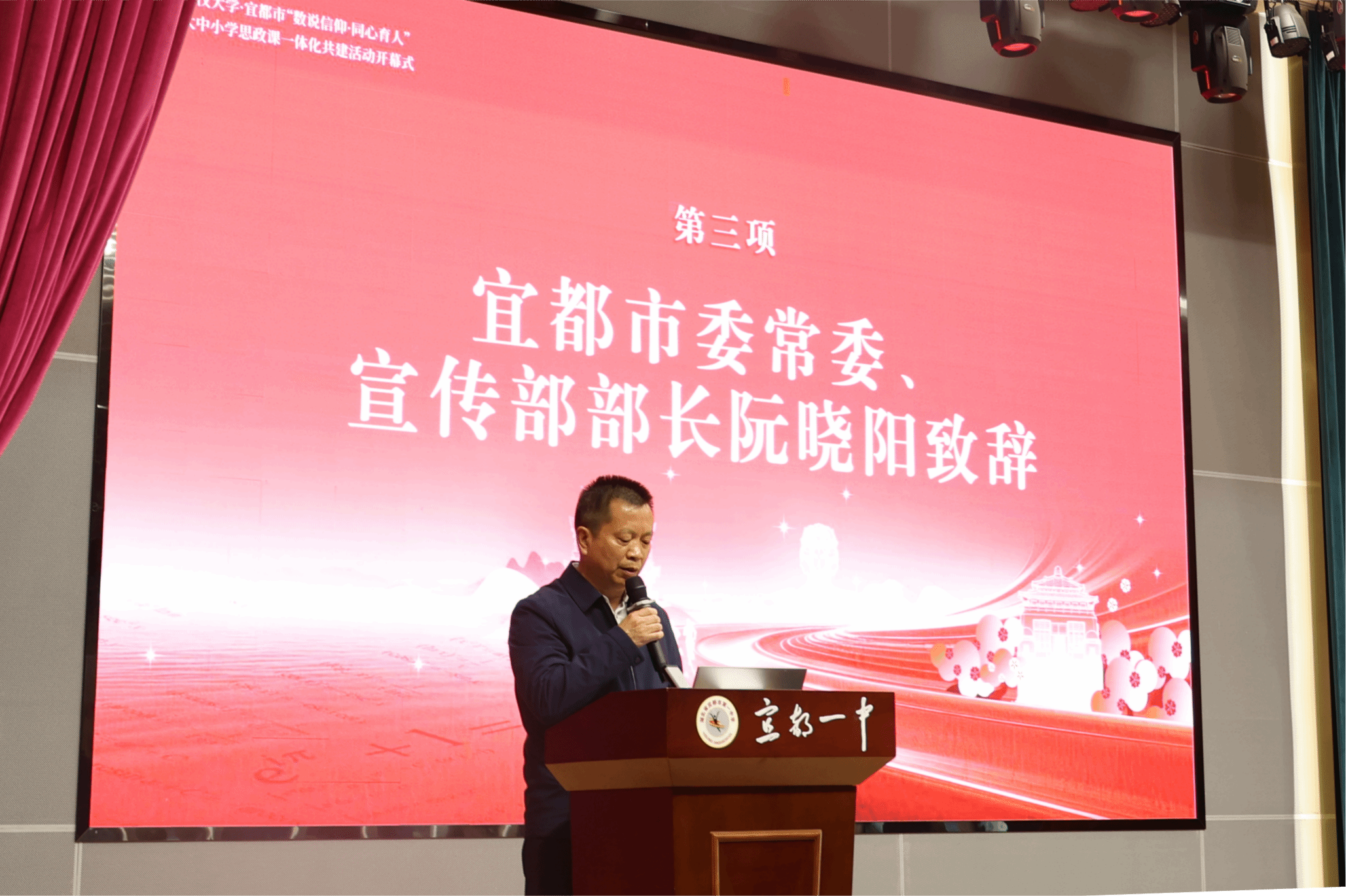 宜都市委常委、宣传部部长阮晓阳在致辞中强调,宜都市委高度重视此次校地合作,将加强统筹协调、精心谋划部署,要求教育部门精心组织、教研部门深度参与,充分发挥地方中小学特色优势,对接高校学科与思政优质资源,打造校地协同推进大中小思政课一体化建设、“数�+思政”融合育人建设的示范标杆�