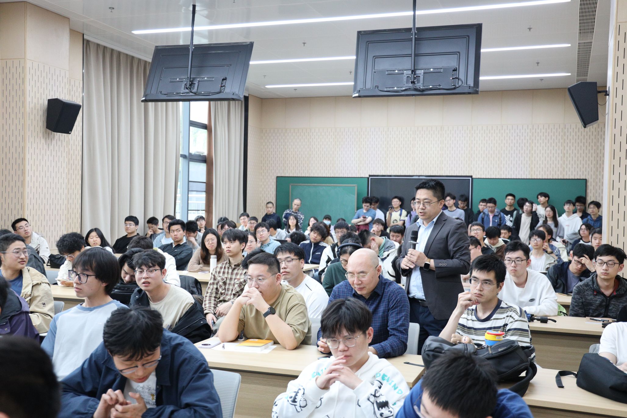 报告结束后,张益唐教授与现场师生进行了热烈的交流互动。结合自身传奇经历,他勉励学子要怀揣笃定信念与平常心,心无旁骛地追求理想,切莫遗失最初的赤诚,坚信从容深耕定能抵达超乎想象的高度。针对“朗道-西格尔零点猜想”的提问,张教授以开阔视野回应,无论猜想证伪还是证实,都将我们引向蕴含独特价值的不同“宇宙”,鼓励大家即便期待破灭也不必气馁,未来始终充满探索可能。现场师生纷纷与张教授交流并合影留念。本次活动不仅为师生带来了前沿的学术思考,更传递了坚守理想、从容豁达的人生智慧。