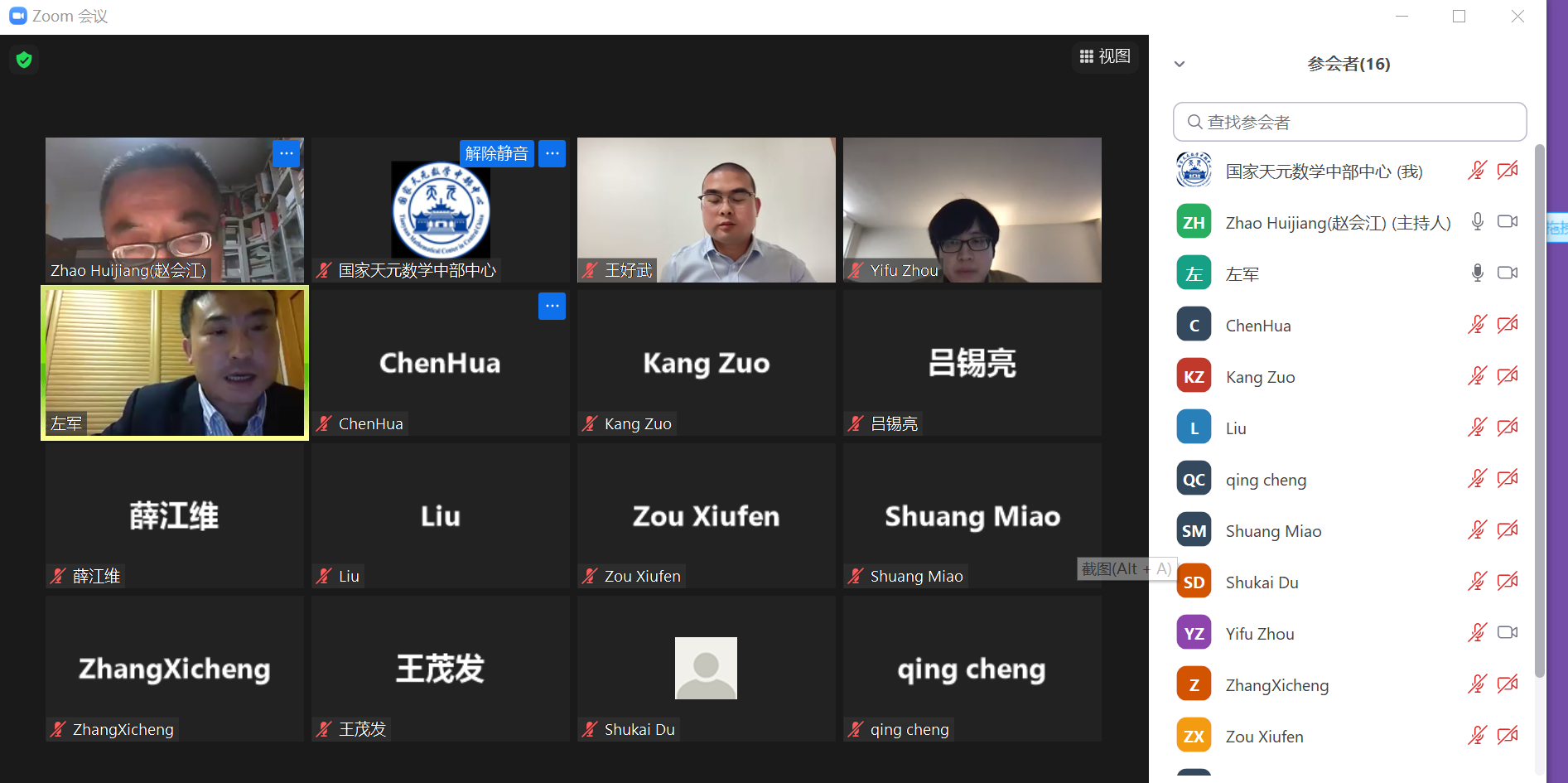 第九届国际交叉学科云论坛数学分论坛活动。五位海外青年学者,院党委书记左军、院长赵会江等院领导,成人导航