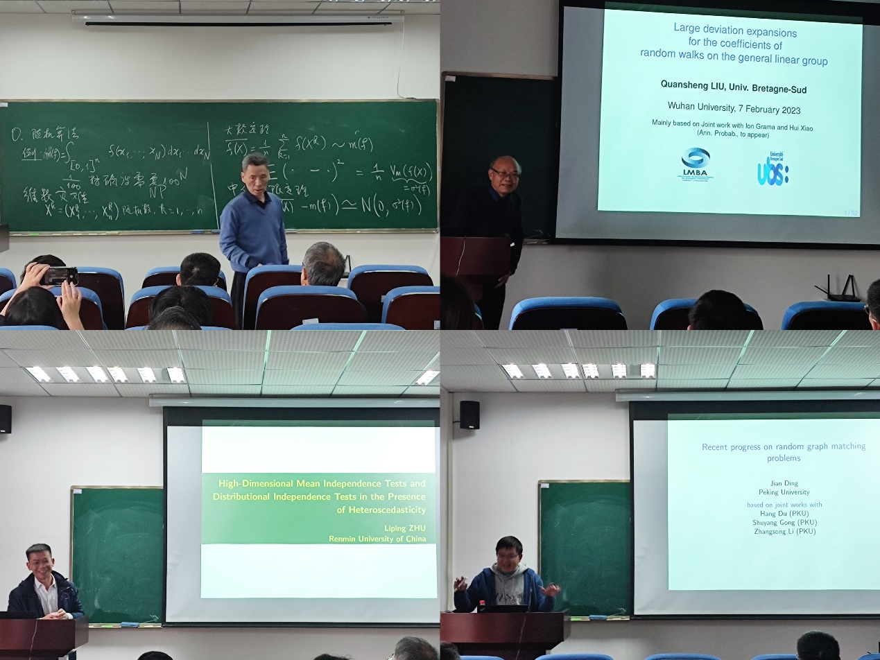 组织召开2023年概率统计学术研讨会。法国克莱蒙奥弗涅大学吴黎明教授、法国南布列塔尼大学刘全升教授、中国人民大学朱利平教授、北京大学丁剑教授先后作学术报告。