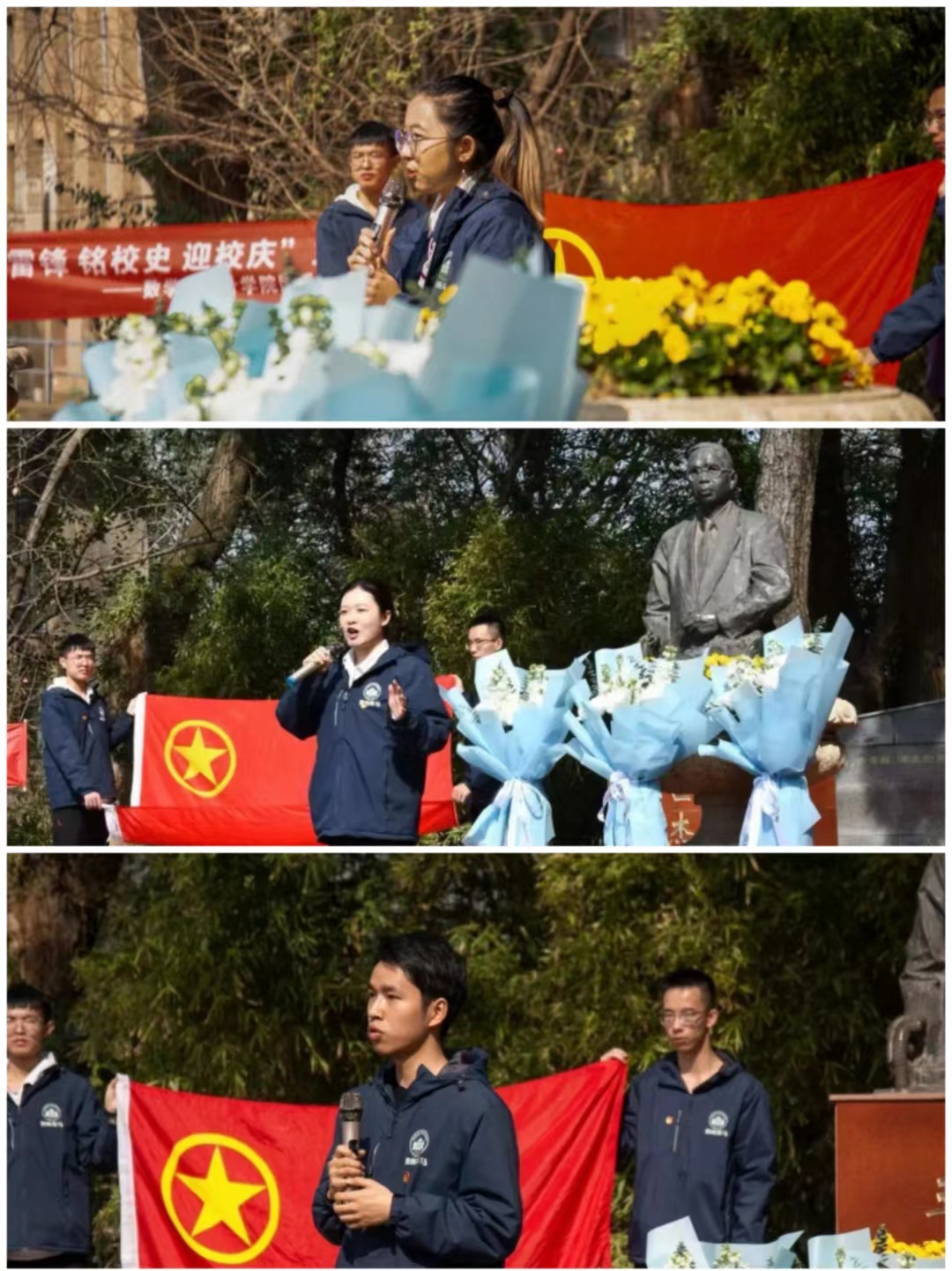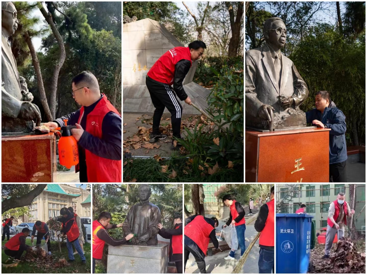 樱顶老图书馆门前,伴随着晨曦与鸟鸣,师生分为五组清扫了樱园各个片区地面与草坪上的落叶及树枝、擦拭了王世杰、王星拱、闻一多、李国平等大师先辈雕像上的灰尘并清理了周边的杂草。
