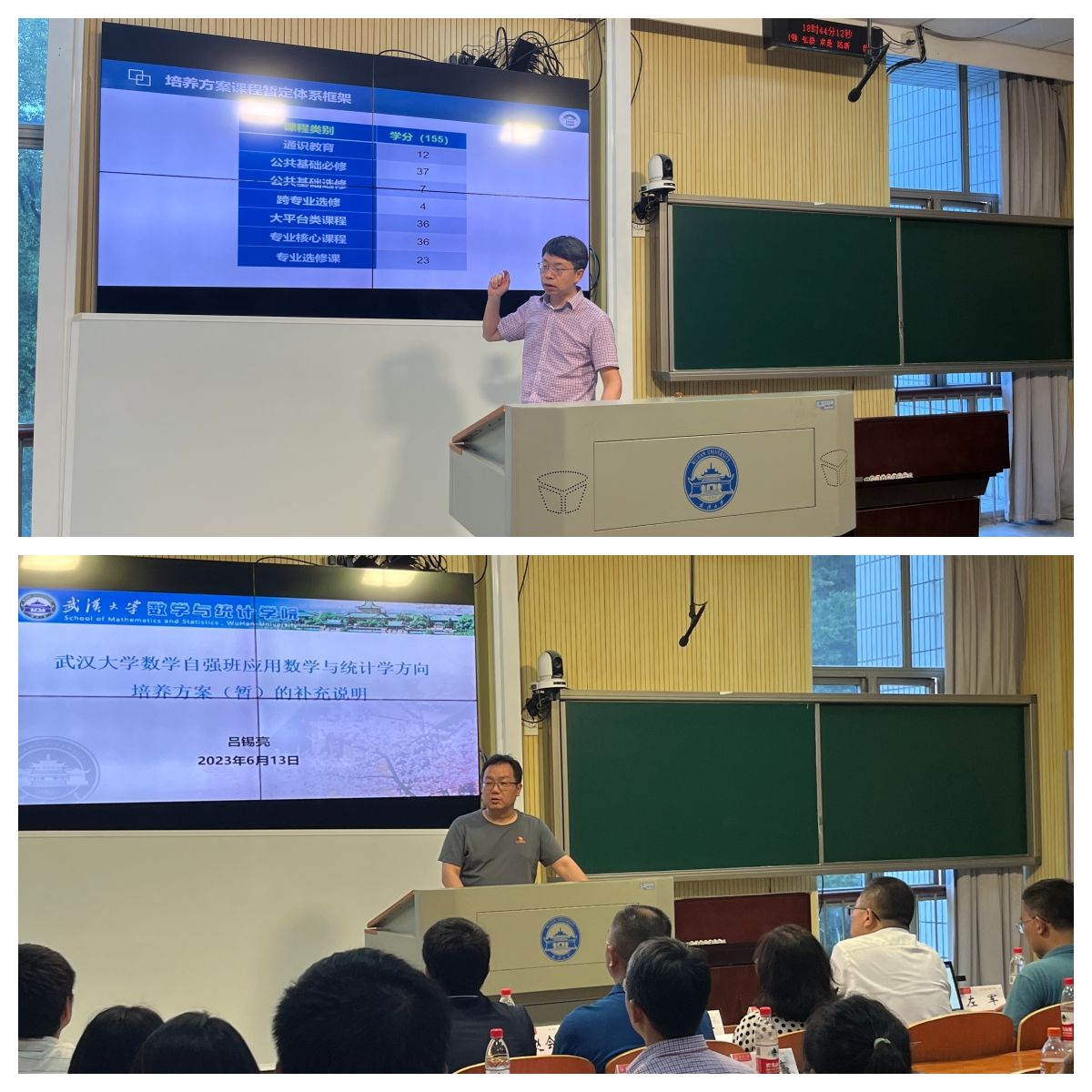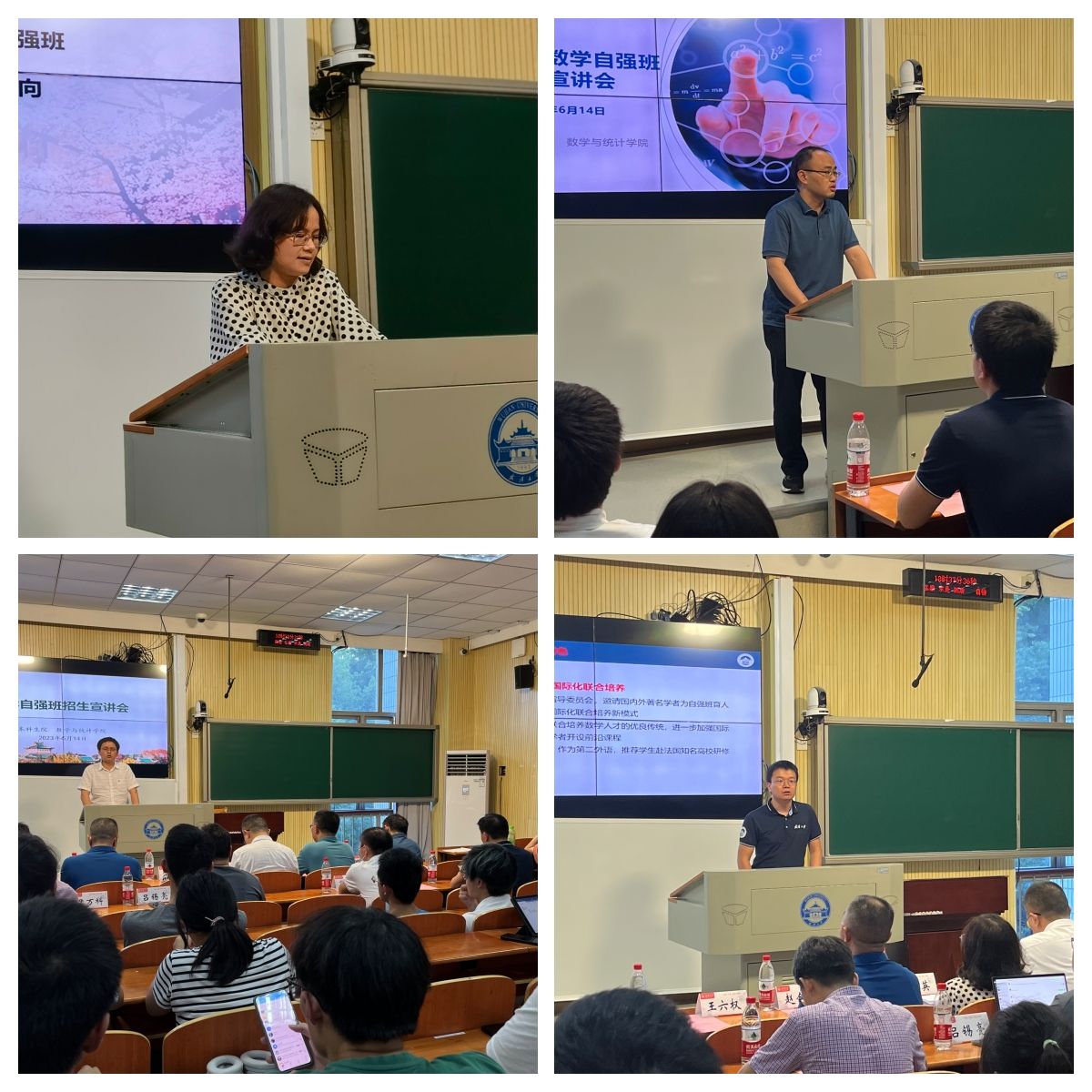 副院长王六权从数学自强班的招生选拔、考核分流、培养特色、与其他试验班的区别等方面对自强班招生简章进行了解读。尹万科教授、吕锡亮教授分别介绍了自强班的基础数学、应用数学与统计学方向的课程设置、学分体系、导师团队。副院长缪爽从数学学科前沿发展状况、自强班培养指导委员会以及法语学习等方面,介绍了数学自强班国际化联合培养的思路。