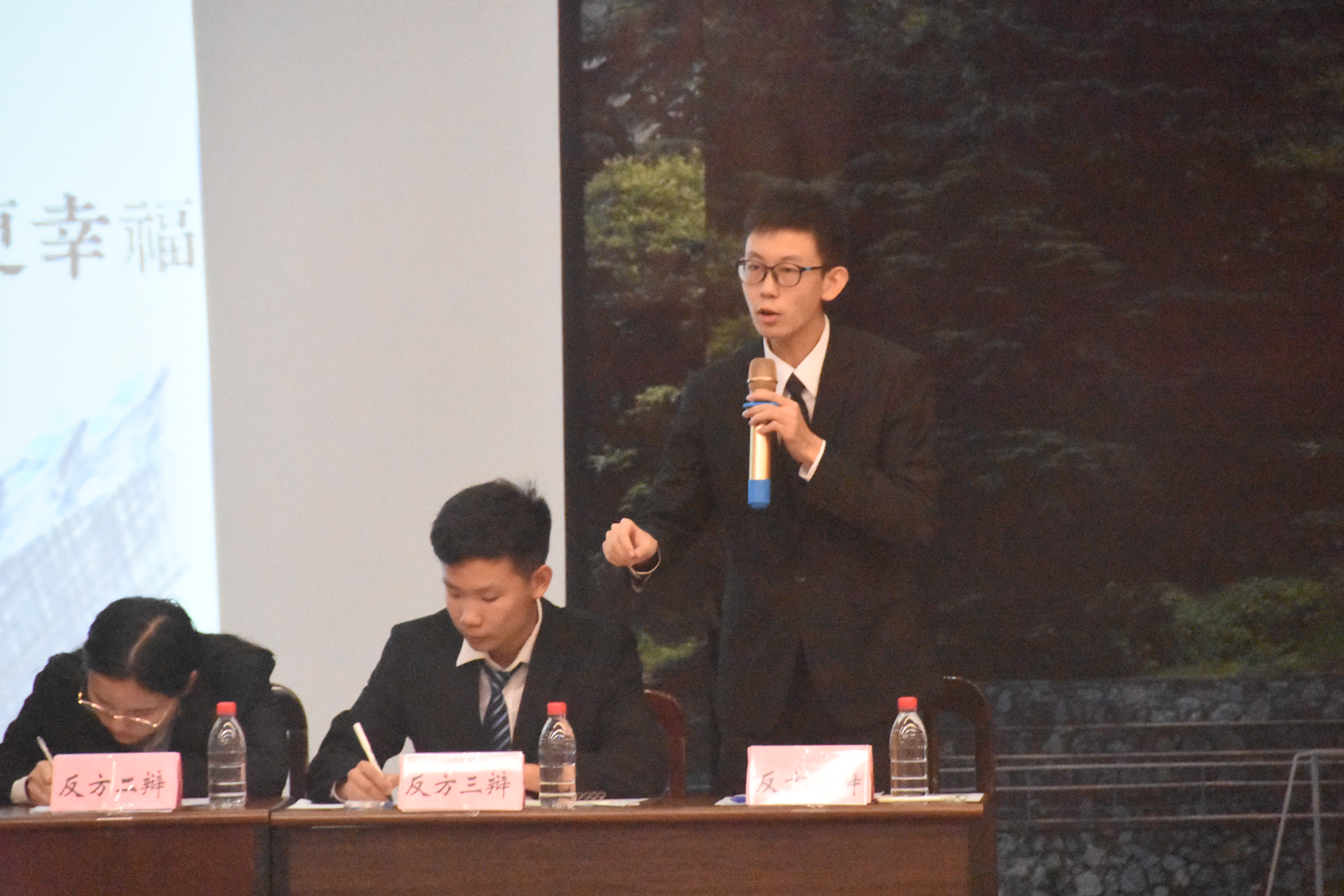 之后便是最激动人心的自由辩环节,我方四辩罗冠华同学才思敏捷,一针见血地指出对方辩友论据的漏洞,并乘胜追击提出问题,使对方辩手词穷。在总结陈词环节,我方四辩针对对手逻辑上的漏洞逐一回击,思路清晰,引经据典。