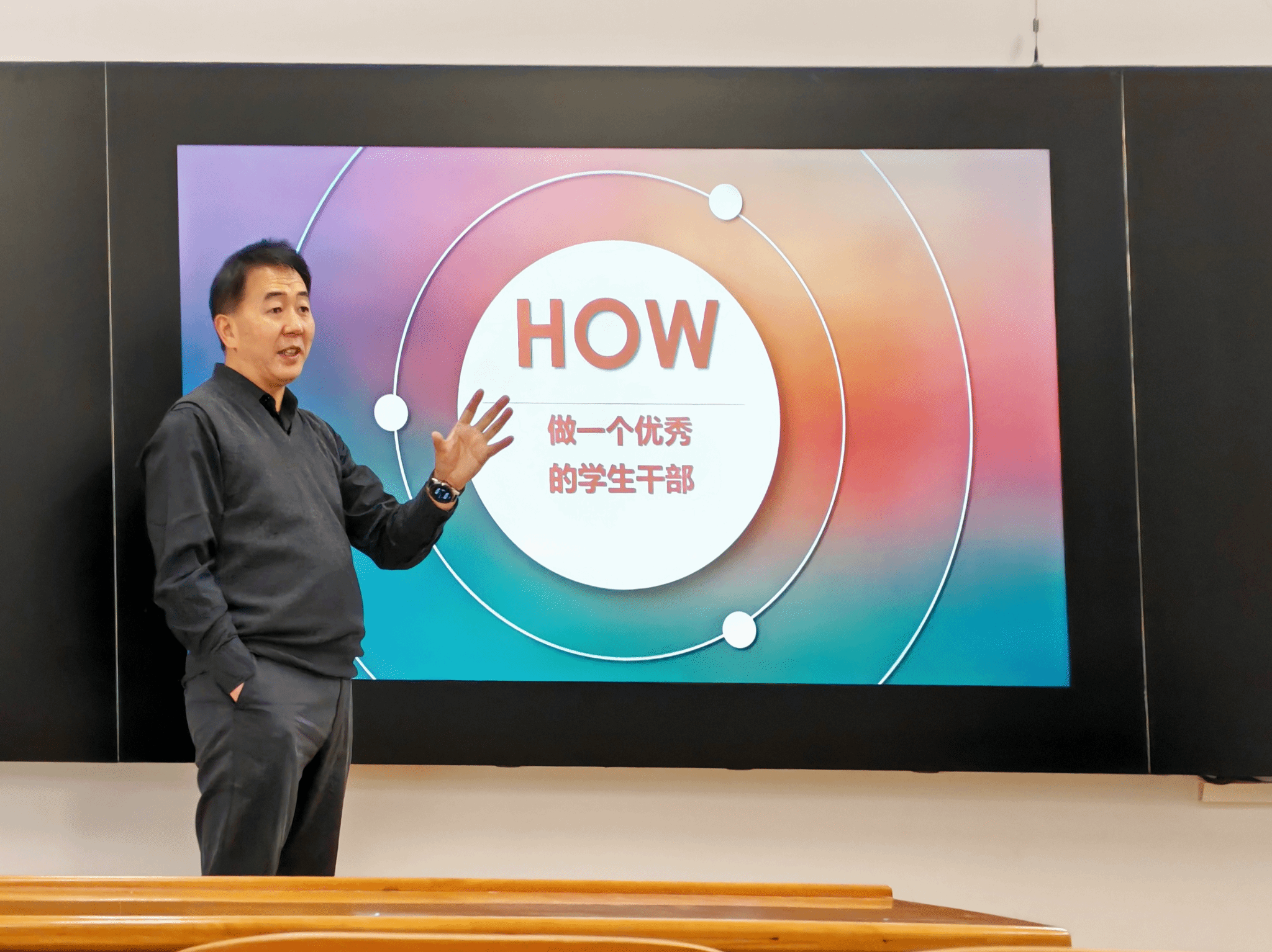 在课程的结尾,汪思明用“公道正派廉生威,海纳百川聚英才。热心助人及时雨,兴趣特长人气旺。”的诗句来总结了做一名优秀的学生干部的方法。他殷切期望在座青马学子都能肩负起责任担当,成为优秀的学生干部。