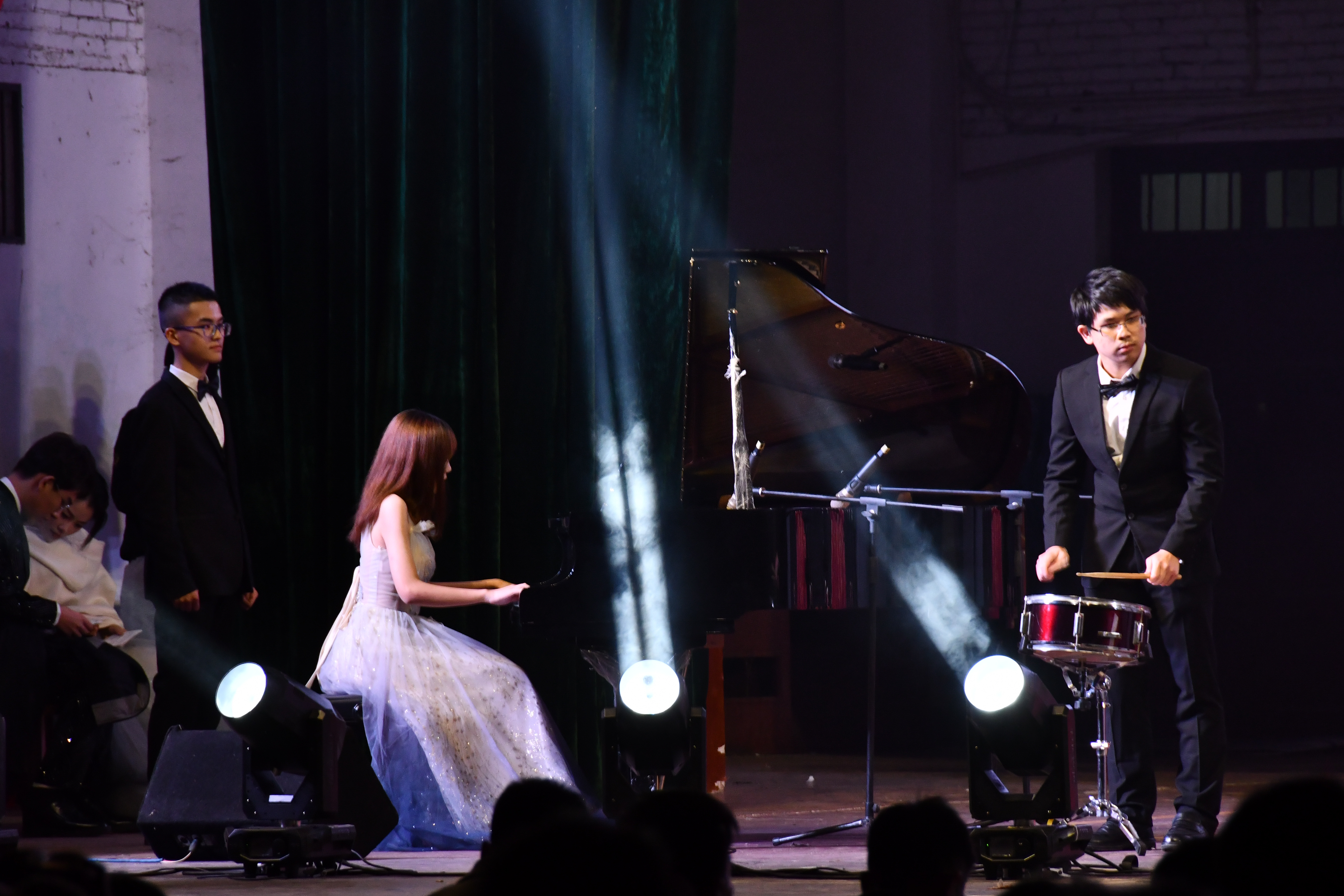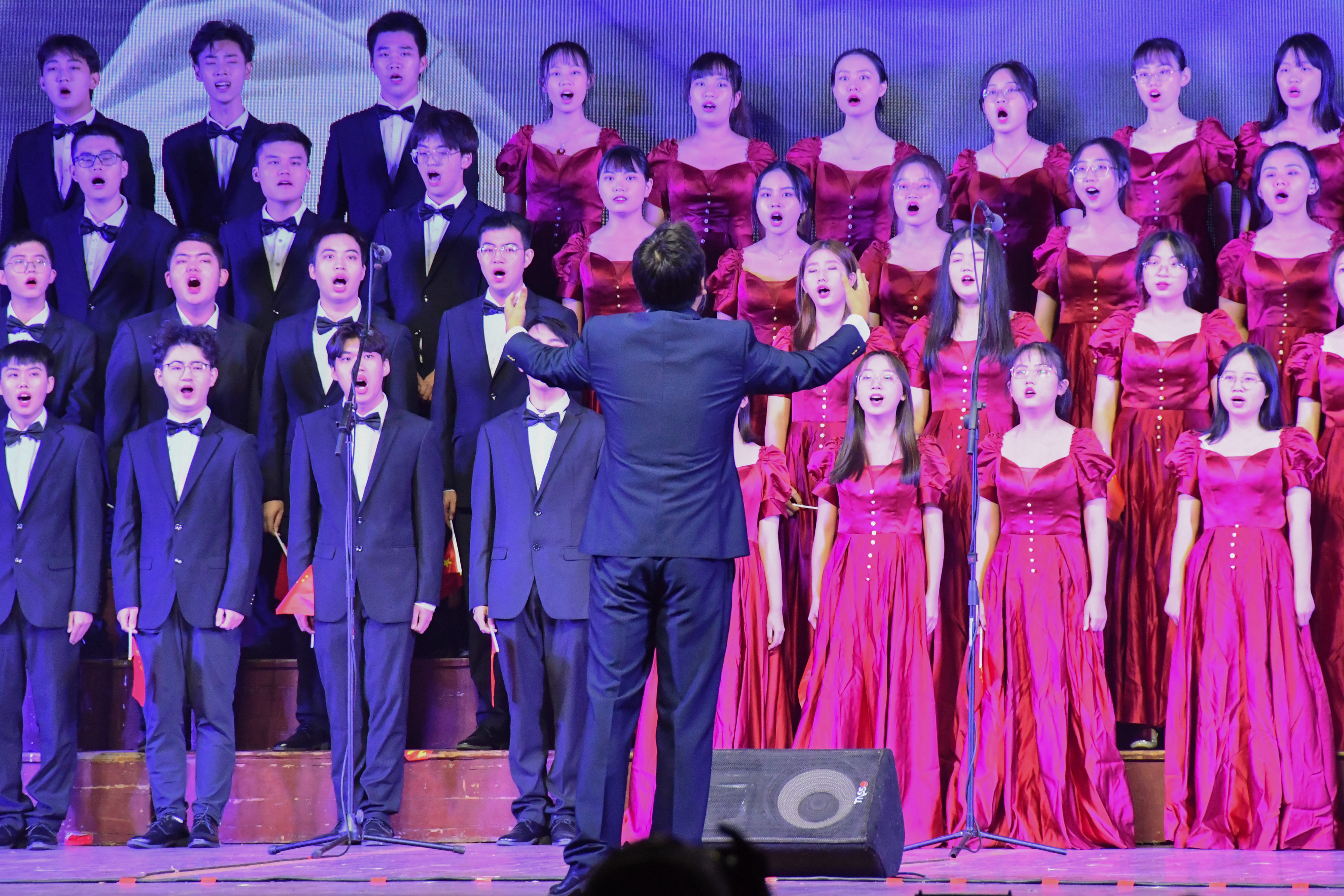 伴随着清扬的钢琴声和节奏鲜明的军鼓音,合唱团男女声部一齐唱起了《我们走在大路上》,男声浑厚有力,女声激昂明亮。学子们激昂唱出中国青年斗志昂扬向上走的气势、唱响为实现中华民族伟大复兴的坚定决心!