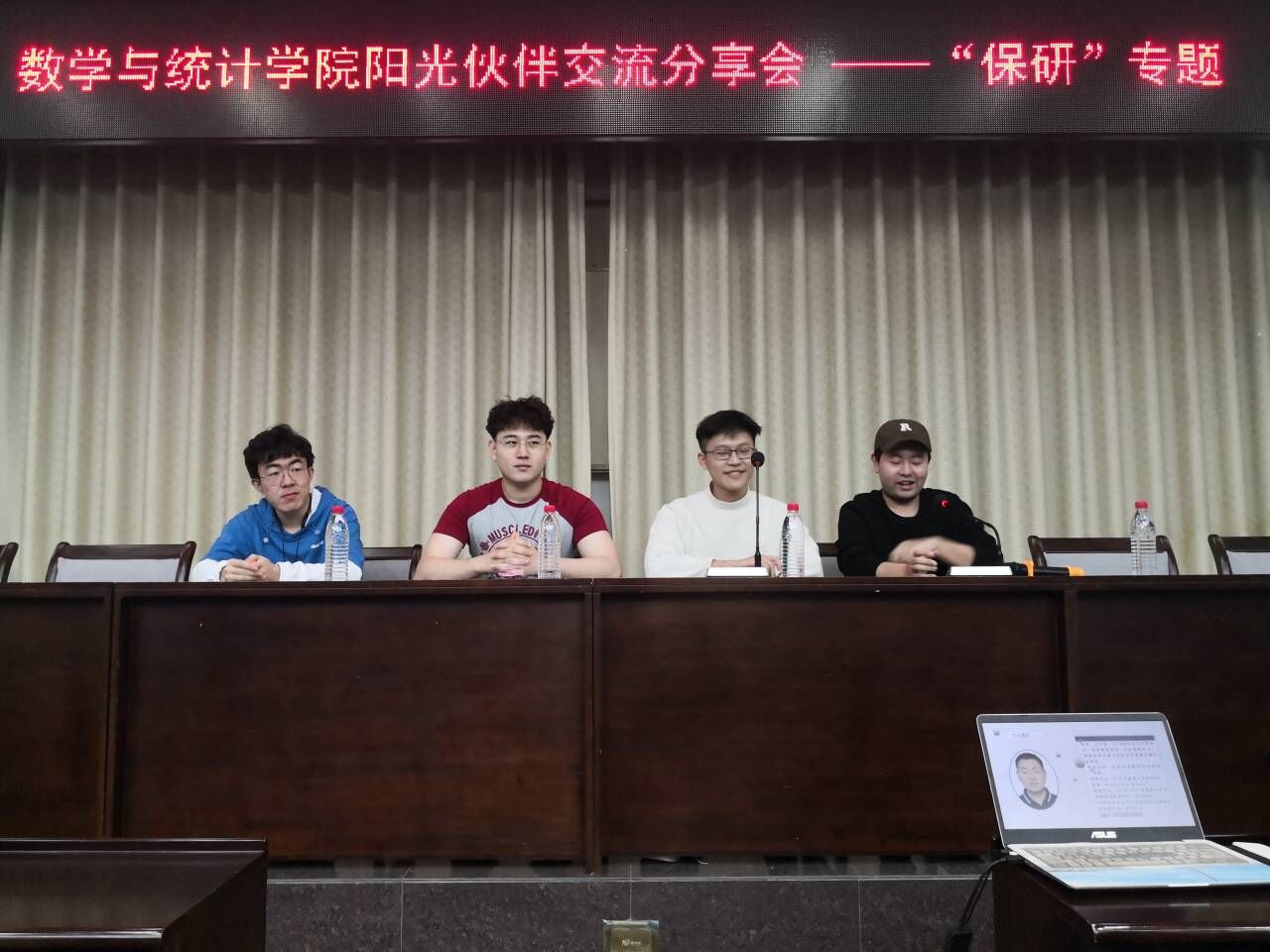 本期阳光伙伴“保研”专题分享会于4月8日16:50在数学会堂顺利举行,分享嘉宾四位:2018级信息与计算科学丁思哲、2018级统计学李轩宇、2018级数学基地班真国诚、2018级数学与应用数学甘天巍。