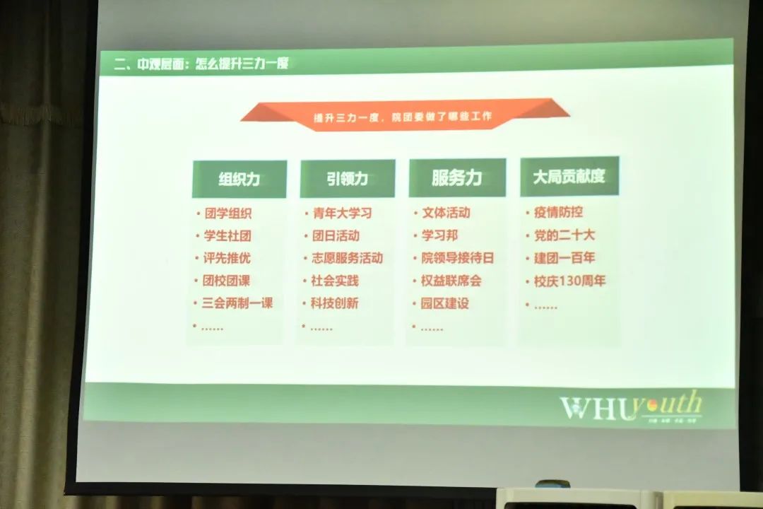 本次授课刘老师就 “从严治团的背景与任务”、“团学组织如何提升三力一度”以及“团员青年如何做好个人发展规划”三个纬度,由宏观至微观视角开展本次授课。