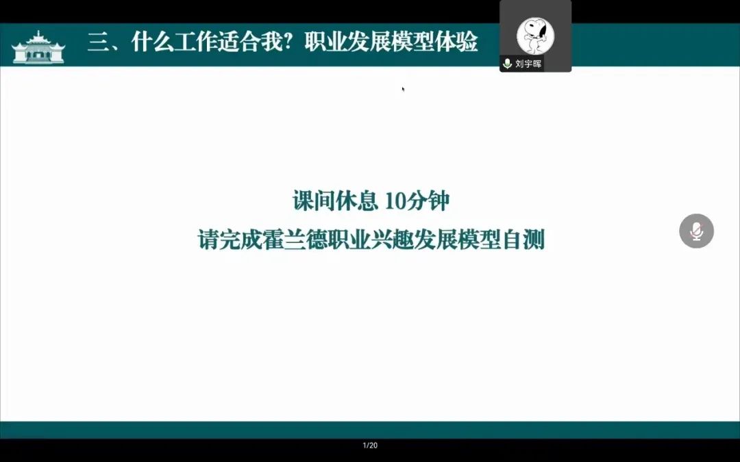 接下来,刘宇晖介绍了霍兰德职业兴趣模型。约翰·霍兰德是美国约翰·霍普金斯大学心理学教授,美国著名的职业指导专家。他认为人的人格类型、兴趣与职业密切相关。在互动环节,刘宇晖指导学员们完成霍兰德职业兴趣模型量表进行自测体验,并对自测结果进行解释和分析,引导大家加强对自身职业兴趣的认知。