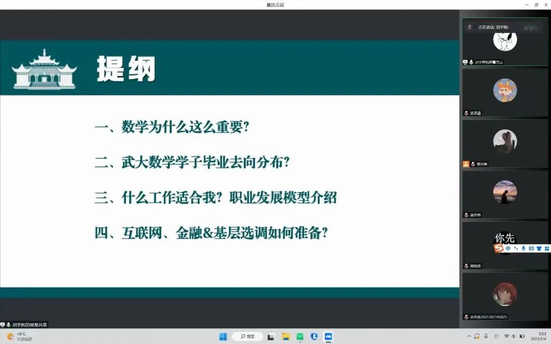 报告从“数学为什么这么重要?”“武大数学学子毕业去向分布?”“什么工作适合我?”“互联网,金融&基层选调如何准备?”四个方面展开。