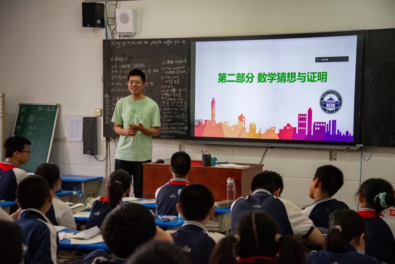 牛顿曾说“没有大胆的猜测,就做不出伟大的发现”。在“数学猜想与证明”部分,为锻炼中学生发现问题、大胆猜测的能力,大学生志愿者从简单的猜想和证明出发,逐步引入费马大定理、哥德巴赫猜想等重大的数学猜想,并简单介绍了陈景润等历史上中外数学家的卓越成就,鼓励中学生们树立敢于猜想,勇于探索的科学精神,立志提出大问题、解决大问题。
