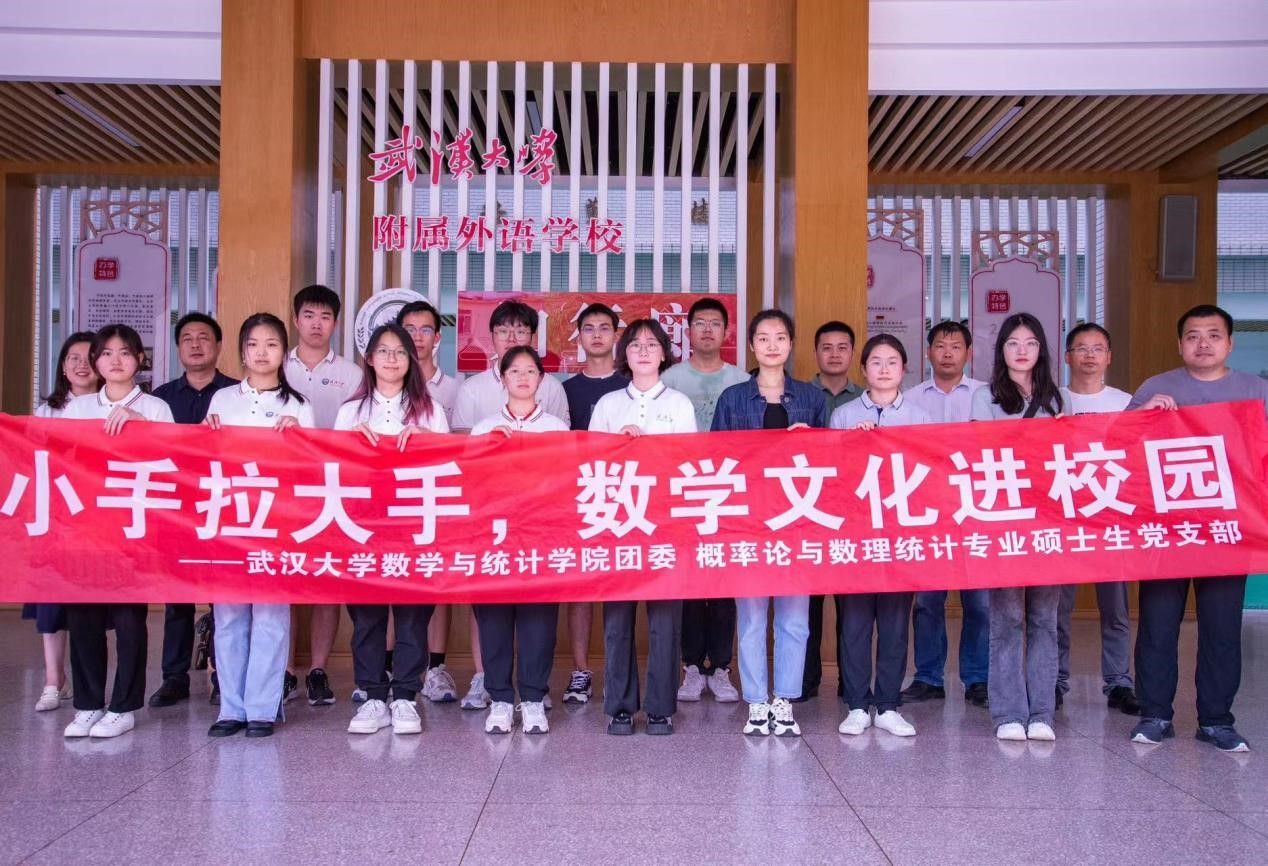 2023年5月19日下午,数学与统计学院首届“青马班”8名本科生和概率论与数理统计硕士生党支部4名研究生走进武汉大学附属外语学校开展“小手拉大手,数学文化进校园”主题党日暨“行走的团课”活动。数学与统计学院党委副书记黄安云、团委书记刘宇晖,附属外语学校副校长周一敏、附属外语学校教务处、七八年级部分班级等参加此次活动。