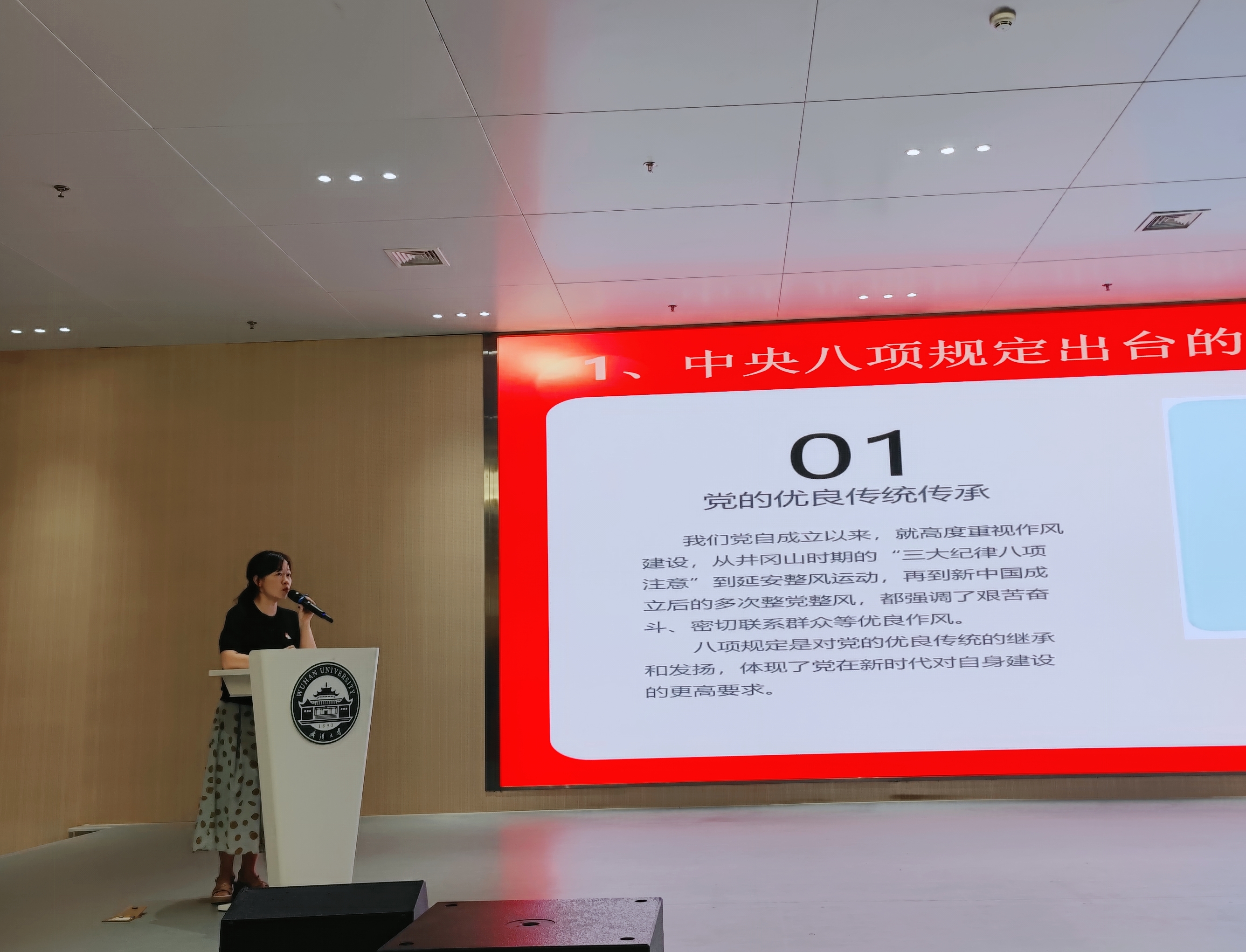 刘珊珊以“落实八项规定,争做合格党员”为题讲授主题党课。她从八项规定的出台背景、主要内容、践行要求等方面展开讲解。她指出八项规定是对党的优良传统的传承,顺应了国际国内形势和时代需求。她详细阐述了八项规定的核心内容及实施细则。对于践行要求,她指出党员个人尤其是毕业生党员,要扎根中国大地深入调研,把个人理想融入时代主题,在创新创业和艰苦奋斗中实现人生价值,用青春书写无愧于时代的华彩篇章�
