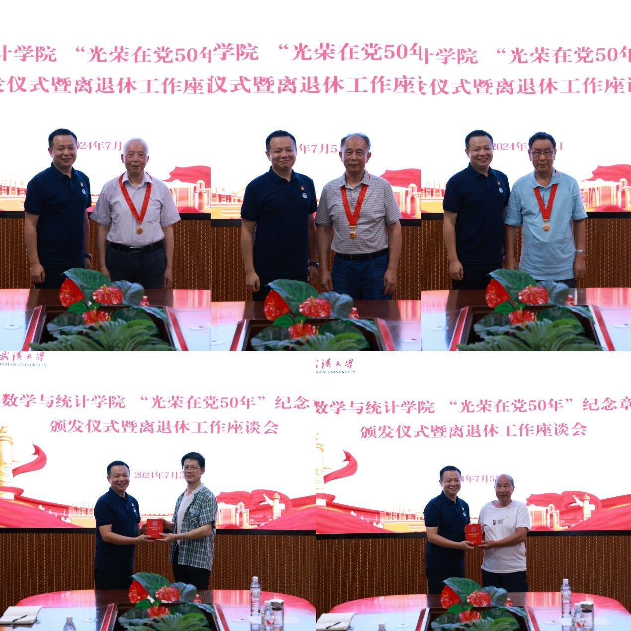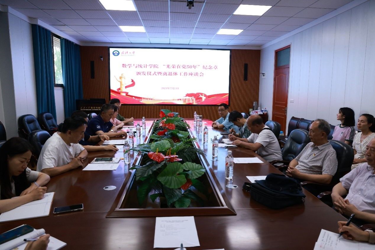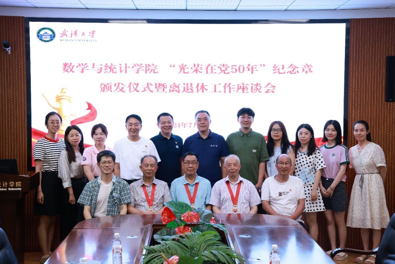李勤代表院党委向“光荣在党50年”的老党员们表达了最崇高的敬意和最热烈的祝贺。他表示,纪念章闪耀着共产党人的精神荣光,见证了老党员们半个世纪的奋斗历程和数学与统计学院半个世纪的励精图治。老党员们坚守对党的信仰,践行对党的忠诚,把自己的青春和热血奉献给了党和人民的教育事业。他希望,年轻一代的同志们能够以老党员们为榜样,坚定理想信念,不忘初心使命,在新时代展现新作为,创建新业绩,为武汉大学的双一流建设贡献青春、力量和智慧,为数学与统计学院的跨越式发展提供更强有力的支持。他表示,党组织将一如既往地关心关爱老同志们,让大家安享晚年,共享改革发展成果,祝愿大家健康长寿,幸福安康!