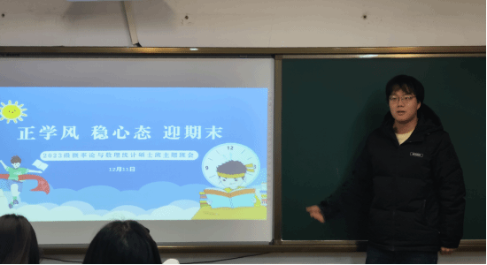 2023级概率论与数理统计专业硕士班举行“正学风,稳心态,迎期末”主题班会。院研究生兼职辅导员、概率论与数理统计专业硕士生党支部的“研途引航师”刘润泽受邀为同学们介绍“测度论”和“高等数理统计”课程的学习经验。班长曾庆辉主持班会。