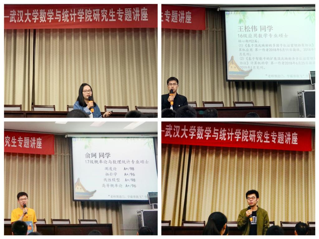 党委副书记黄安云老师出席了讲座,本次讲座邀请到了三位青年教师代表和四位获得2018年度国家奖学金的优秀研究生进行学术科研之路分享,青年老师分别是:基础数学专业的洪桂祥老师,计算数学专业的陈国贤老师,概率论与数理统计专业的刘伟老师。研究生代表是:基础数学专业的陈家乐同学,概率论与数理统计专业的俞珂同学,计算数学专业的曹朦同学和应用数学专业的王松伟同学。