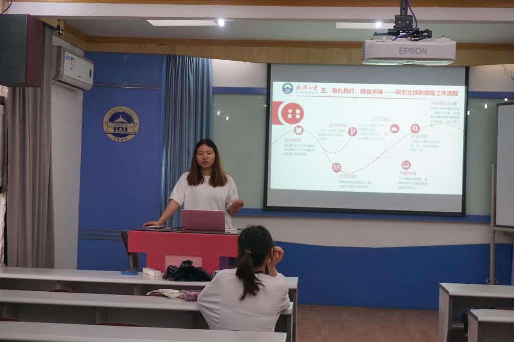 研究生创新实践协会的秦路杰主席和王硕副主席分别进行了挂职锻炼流程介绍和挂职经历分享。参会的有17、18级的研究生,会议由成人导航