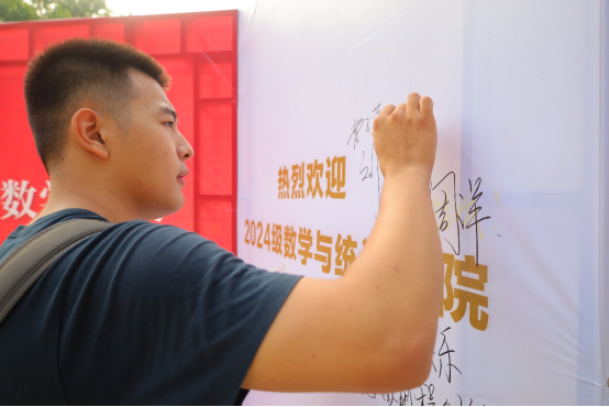 的温暖与关怀。报到手续完成后,同学们在明信片上写下了对未来的憧憬与对学校的祝福;在签名墙前定格加入数统大家庭的温暖瞬间。