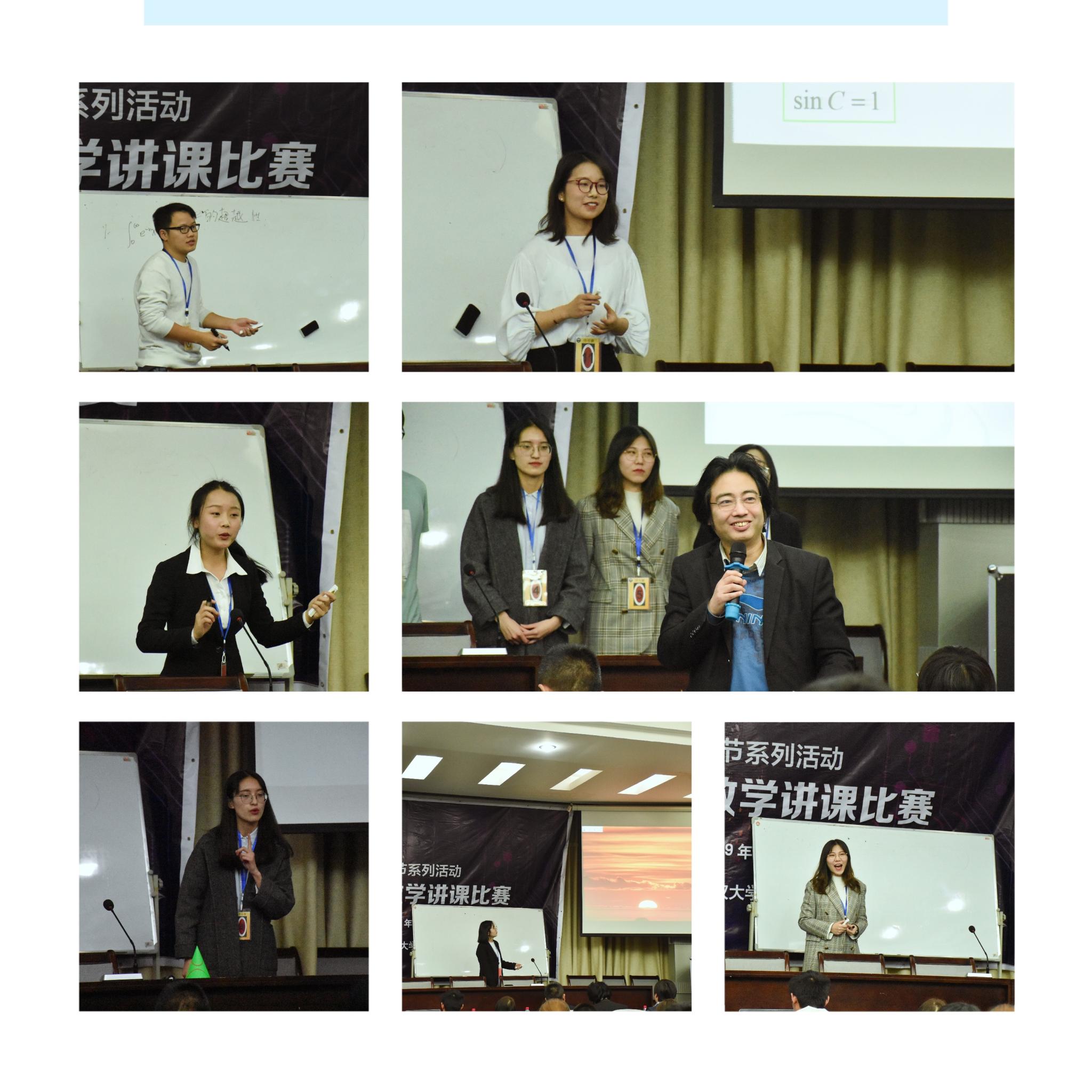 在主持人简要介绍了本次讲课比赛的评分规则后,比赛正式拉开了帷幕。12名参赛同学按照赛前的抽签顺序依次上台,六位同学一组,每组讲课结束后,由评委老师进行点评,讲课时可采用多媒体、板书等多种形式,限时10分钟。选手们讲课的内容广泛,涵盖了中学数学的许多重要知识点,如正弦定理、三角函数公式、椭圆的定义、圆与直线、圆与圆的位置关系、对数运算、等差数列、等比数列前n项和等,此外,也有同学选择超越数的相关内容进行展示。参赛选手或结合实例、或注重教学情景设计,运用启发式、探究式等教学方式,讲解知识要点,拓展知识深度与宽度。同时还注重台下的观众互动,调动起“模拟课堂”的课堂气氛。