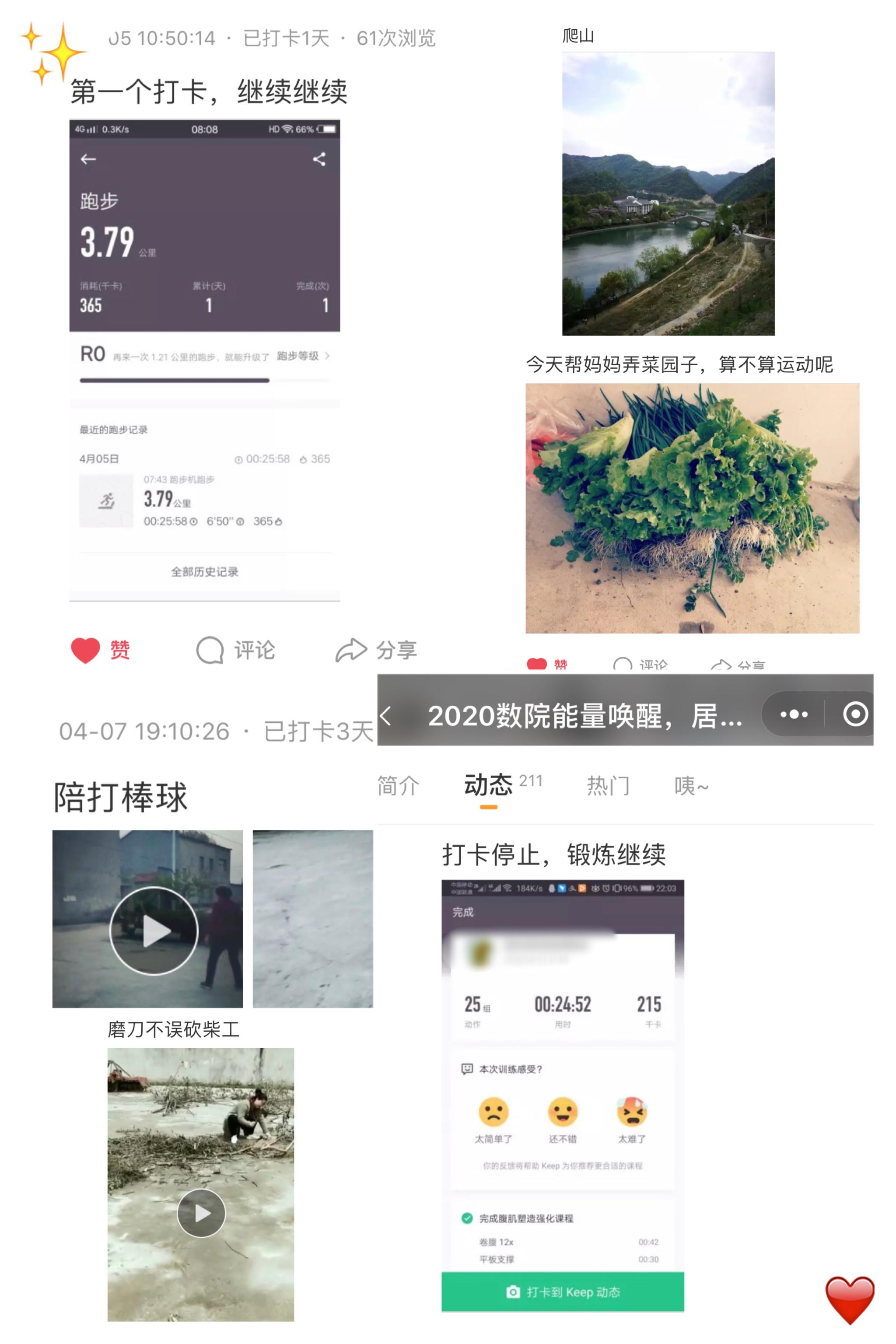 4月6日,活动正式开始,同学们根据自己的运动习惯在微信小程序“小打卡”的“2020数院能量唤醒,居家健身”圈子中发布自己的运动图片、运动软件截图等,体育部的同学每天会在微信群中发布贴心的打卡提醒,大家在群里积极讨论,互相分享好的运动视频、运动软件和运动心得。10天的健身打卡在不知不觉中进入尾声,不难发现,即使在家,也有多种多样的体育运动形式可供选择,跑步、健身操、瑜伽、爬山等成为最受欢迎的活动形式,也有同学在这段时间分享和家人一起劳作的图片或视频。