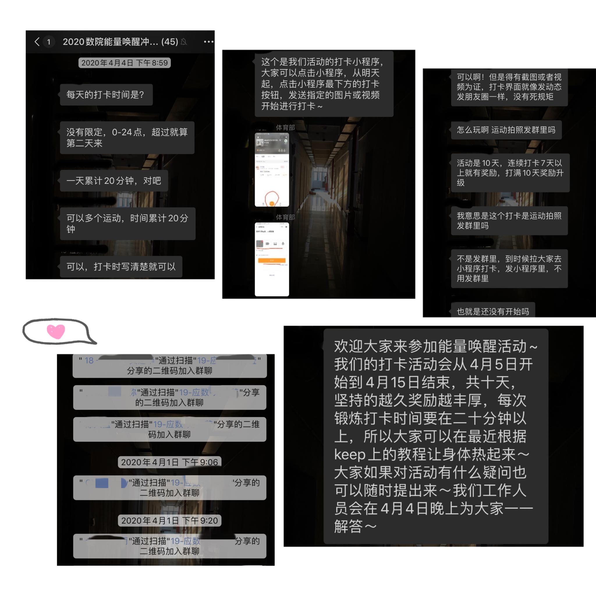 4月1日,活动报名开始,同学们积极响应踊跃报名。为方便活动的进行,体育部同学建立微信群,针对同学们的疑问,工作人员认真解答,最终有四十余名同学加入这场健身活动。