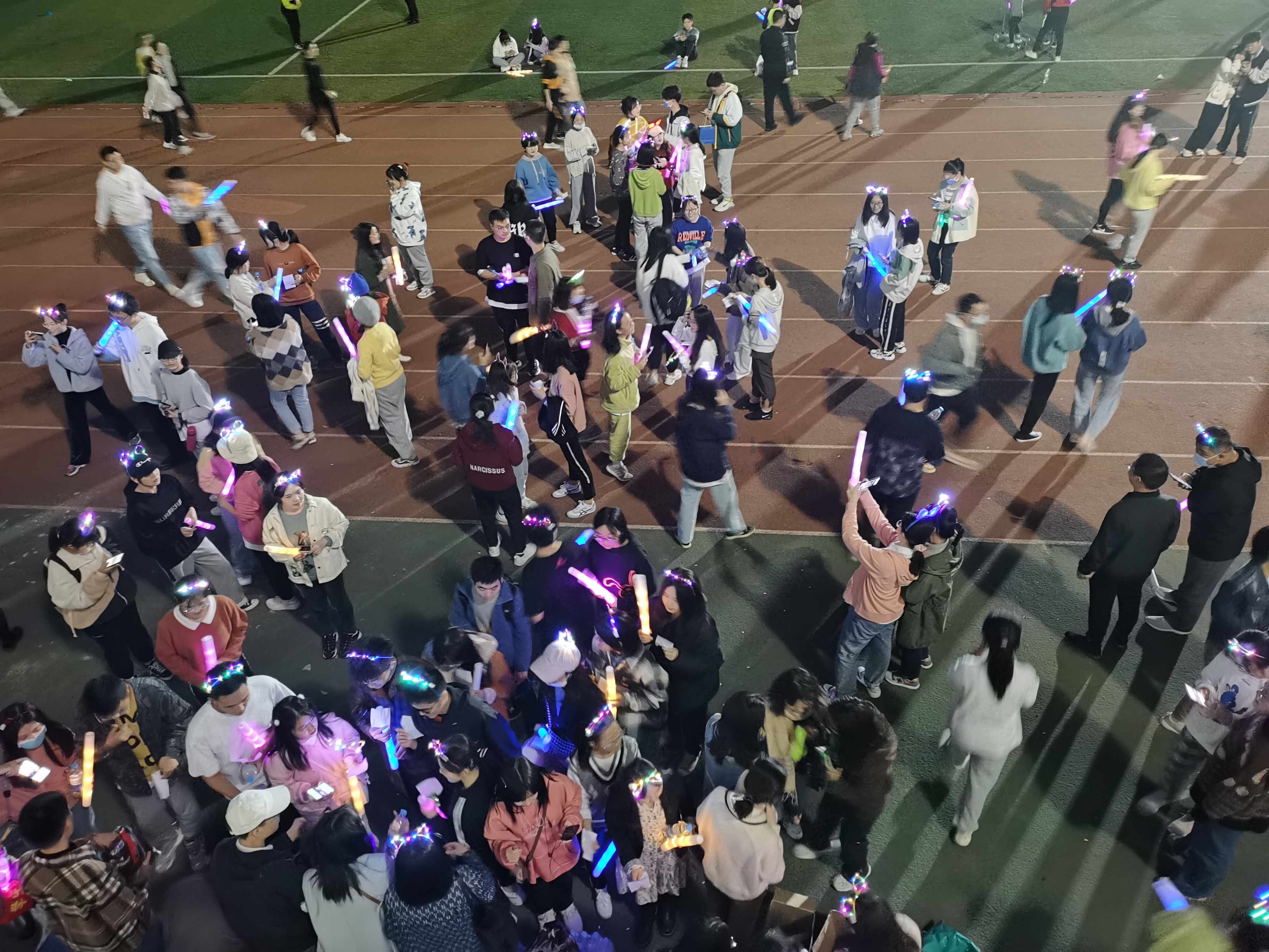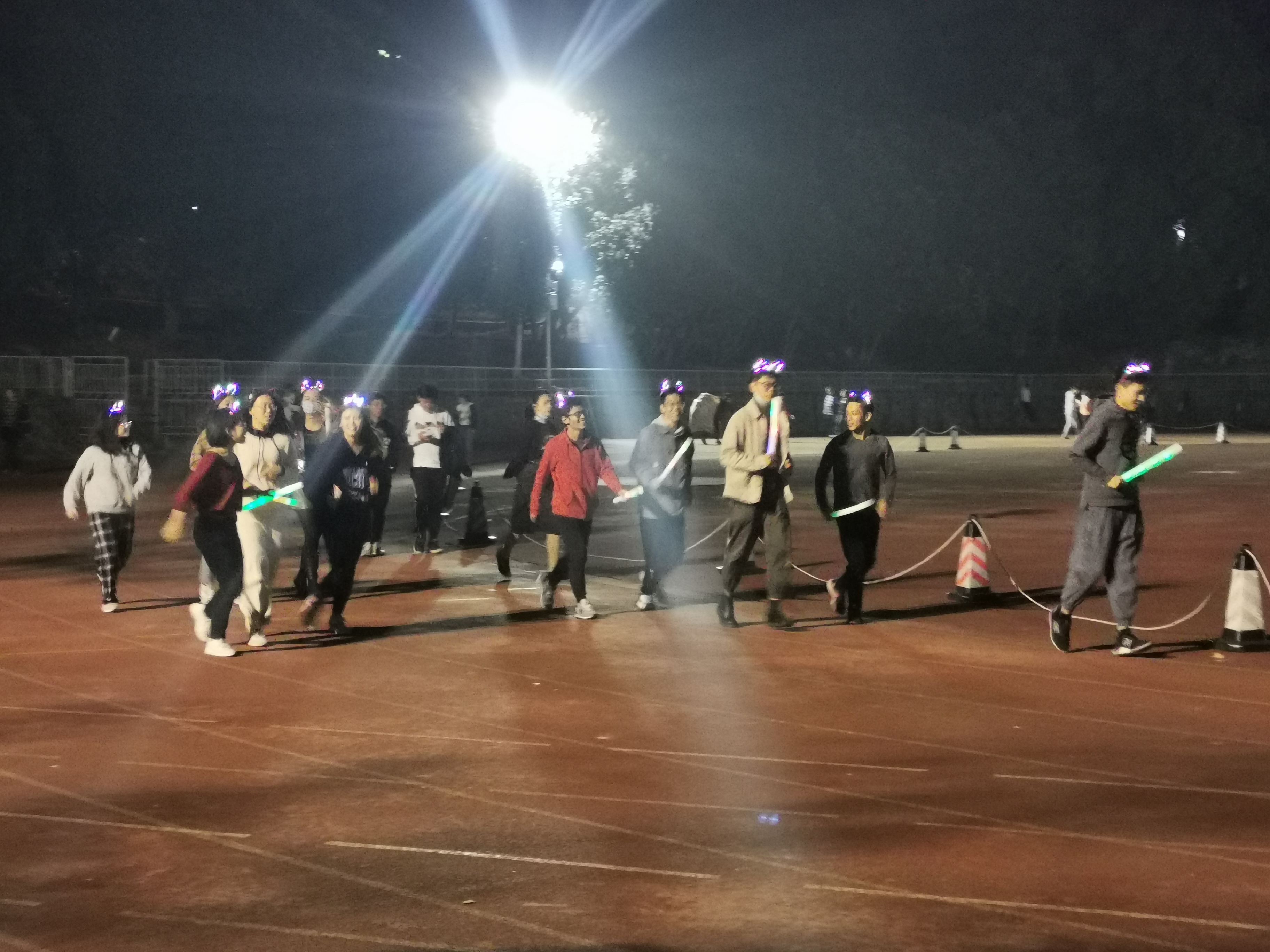 九一二操场参加本次活动。同学们依次有序签到后向工作人员领取了号码牌、荧光棒、荧光头箍,临近七点时操场已是一片闪闪发光的繁星。