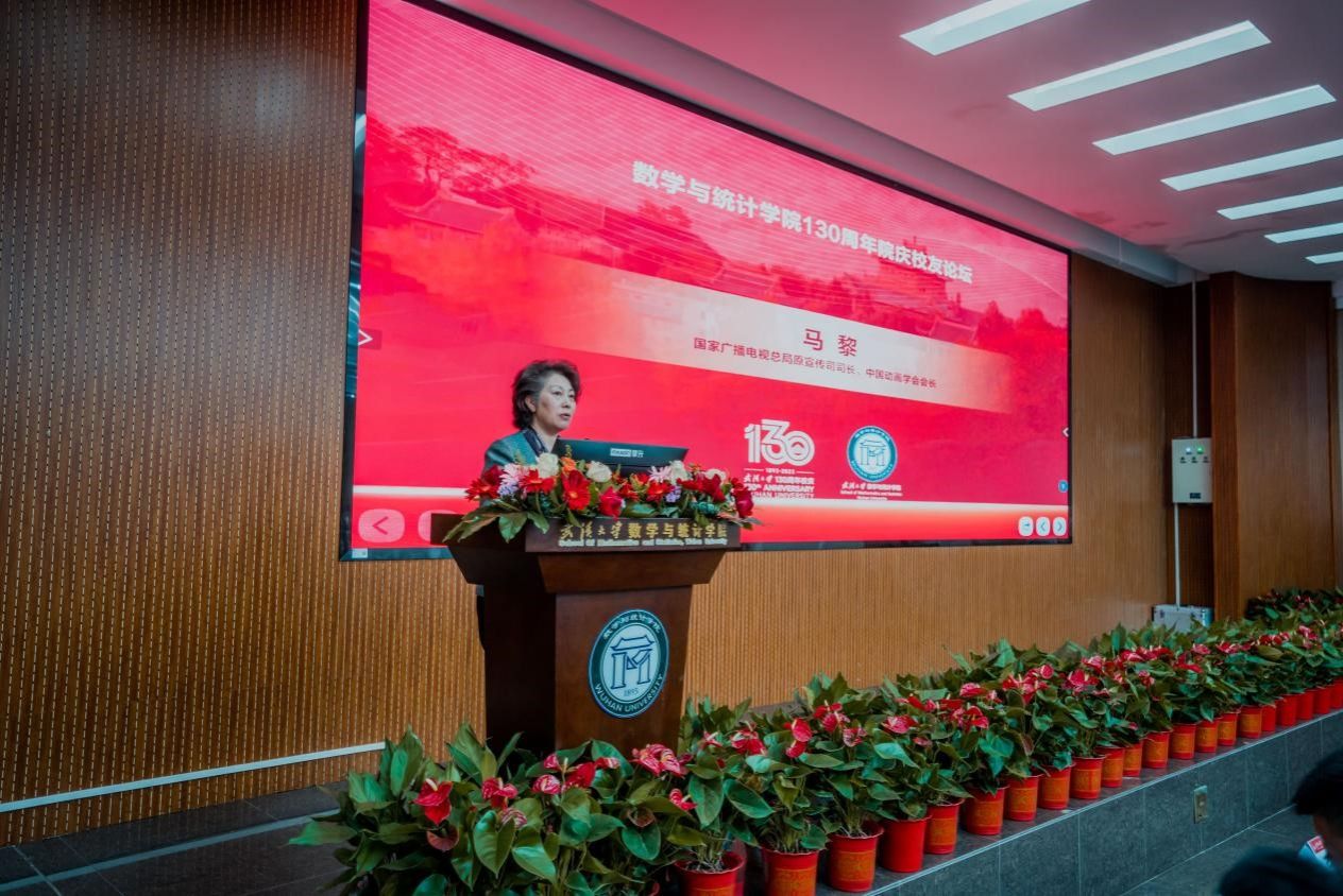 中国动画学会会长、国家广播电视总局宣传司原司长、1978级校友马黎祝贺我院隆重圆满召开数学学科创建130周年发展大会。她追忆了在母校难忘的学习、工作经历,分享了其职场发展的心得感悟。她表示,数学的严谨性和逻辑性令其终身受益。她介绍了在国家广播电视总局司长任上,致力于推动中国优秀文化产品输出的工作,她表示,作为武大数学人,能促进中华民族文化向世界传播倍感自豪。