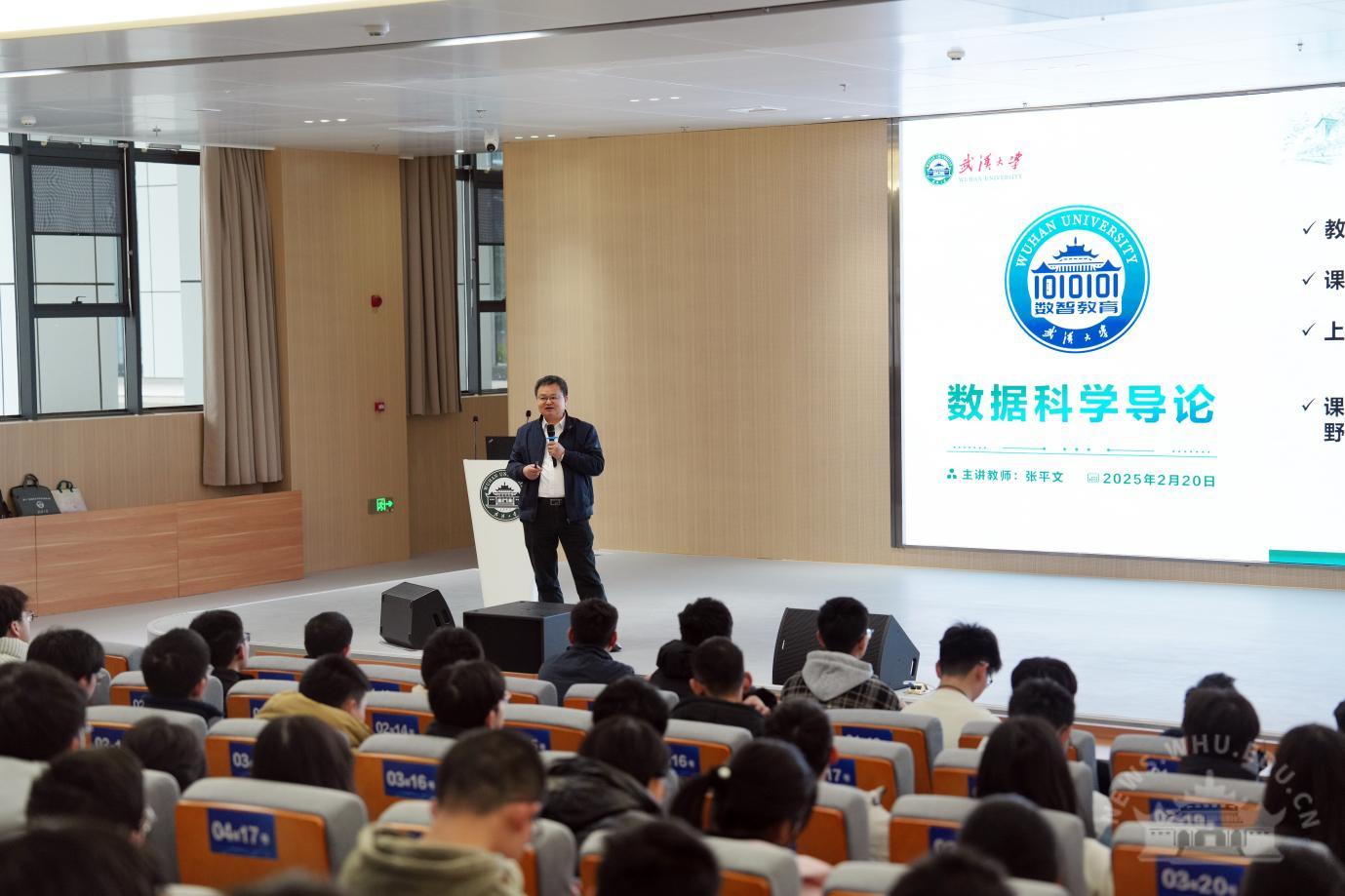 On the morning of February 20, Academician Zhang Pingwen, President of Wuhan University, delivered the first lecture of “Introduction to Data Science” to 230 undergraduate students majoring in mathematics from the Class of 2023 at the School of Mathematics and Statistics in the Lei Jun Building Auditorium. As an important part of Wuhan University’s core “Four-in-One” general education curriculum system, this course is not only a core component of intelligent-digital education but also an interdisciplinary course designed to empower the dissemination of scientific and technological innovation through digital means, strengthen digital thinking, and promote cross-disciplinary application. Zhang Pingwen explained the basic concepts and applications of data science in a clear and engaging manner, sparking great interest among the students in this cutting-edge field and demonstrating the university’s strong commitment to undergraduate education.