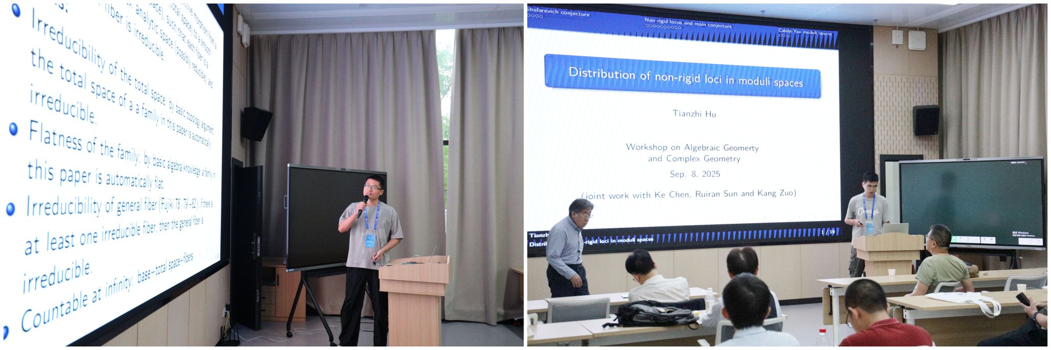 学术会议期间特设短报告环节,邀请青年学者华中师范大学博士后陈健和武汉大学博士生胡天智,分别就偏纤维双亚纯映射及局部Moishezon族双亚纯型的特化、模空间中非刚性集的分布等前沿课题作学术报告,这一环节进一步丰富了工作营的学术层次,展现了青年科研力量在基础数学领域的创新活力。