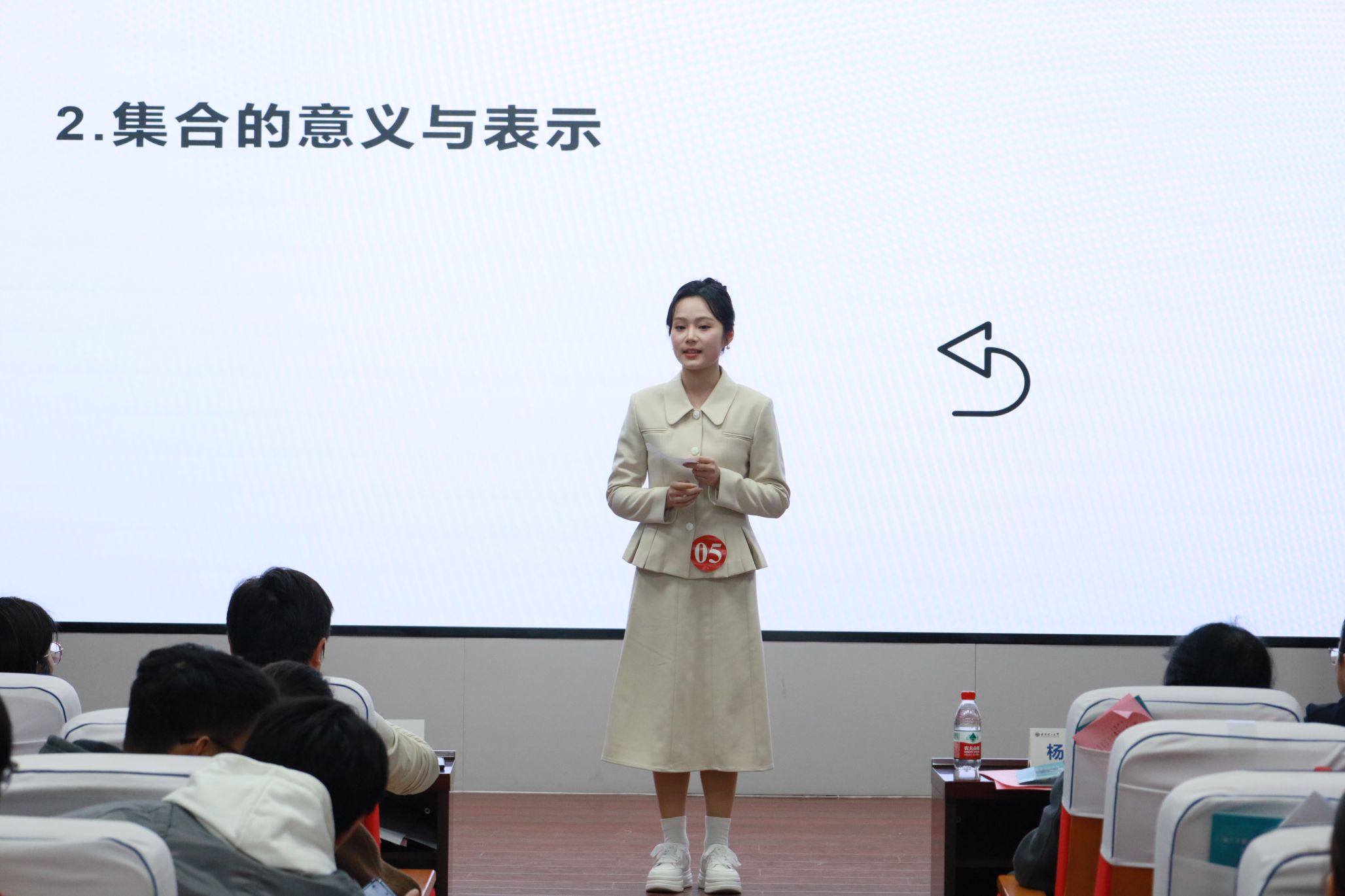 在自选课题讲授环节,十一位选手围绕集合、平面向量、圆锥曲线、导数、余弦定理等中学数学核心内容展开教学。有的选手以趣味故事导入引发课堂互动,有的运用生活实例揭示知识应用,也有的通过严密的逻辑推演层层深入,引导学生自主思考。他们凭借清晰的授课思路、生动的语言表达以及灵活的教学策略,展现出各具特色的教学风格,充分体现了扎实的教学功底与良好的课堂驾驭能力�