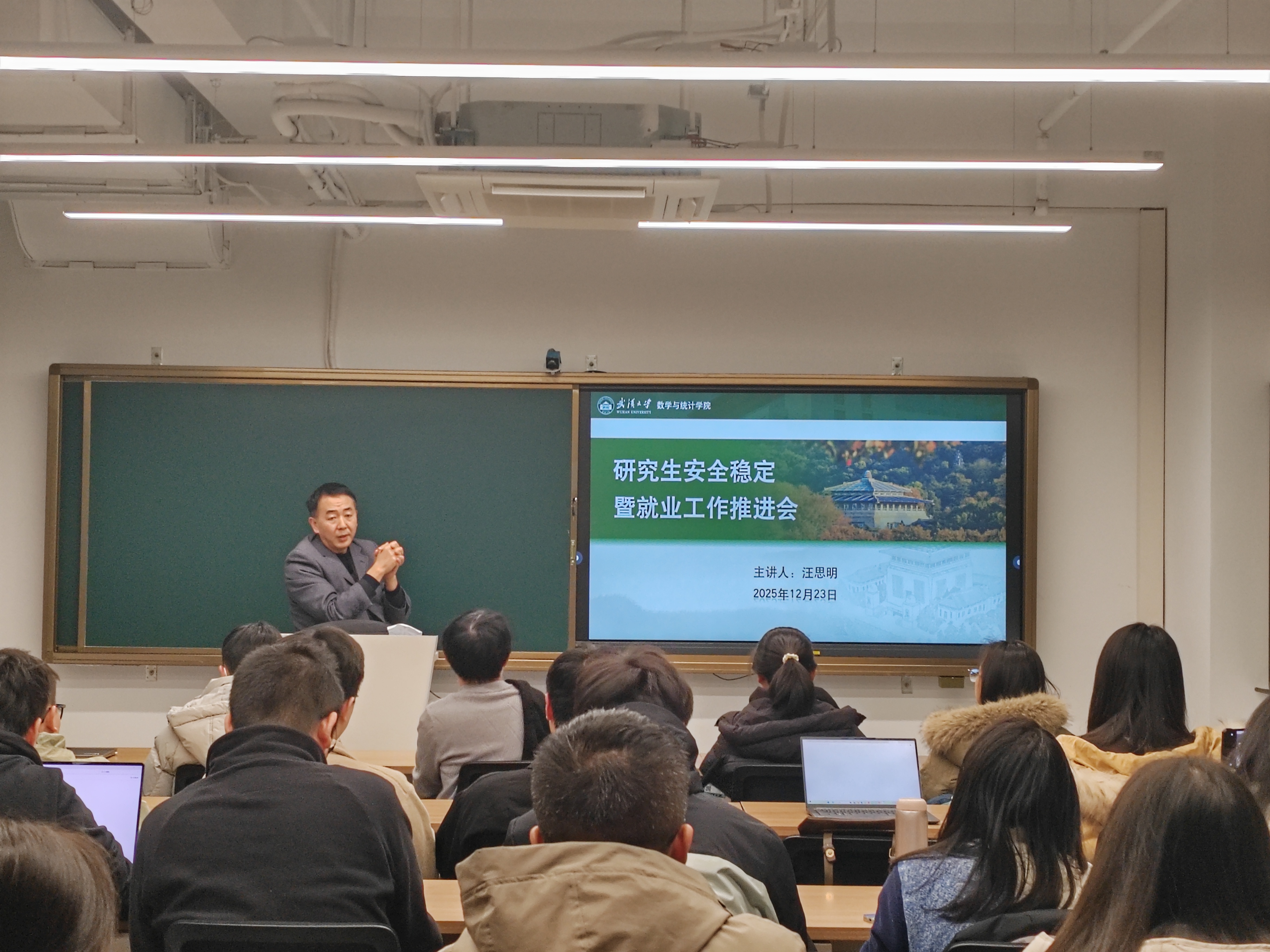 12月23日下午,我院在A419会议室组织召开研究生安全稳定暨就业工作推进会。党委副书记汪思明和全体研究生学生骨干参会。汪思明结合实际案例,面向全体参会学生进行了安全教育和就业动员。
