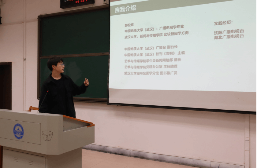 大会第二项由新任2021兼职辅导员郭松直进行自我介绍。郭老师从微信推文、期刊作品、活动策划、视频作品几个方面向大家详细介绍自己的专业特长与实践成果,并欢迎大家遇到简历排版、活动策划、活动宣传等自己专业所涉猎的问题时随时与他沟通交流,共同进步。