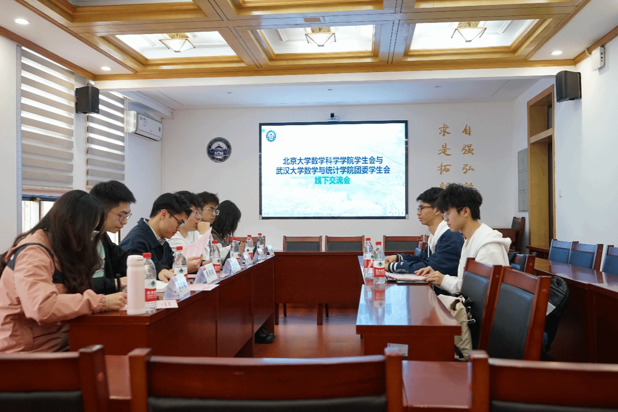 3月16日,北京大学数学科学学院学生会与武汉大学数学与统计学院团委学生会线下交流会在数学与统计学院205会议室成功举办。本次交流会邀请到了北京大学数学科学学院学生会主席胡立宇和刘明昊同学,武汉大学数学与统计学院团委学生会骨干出席。