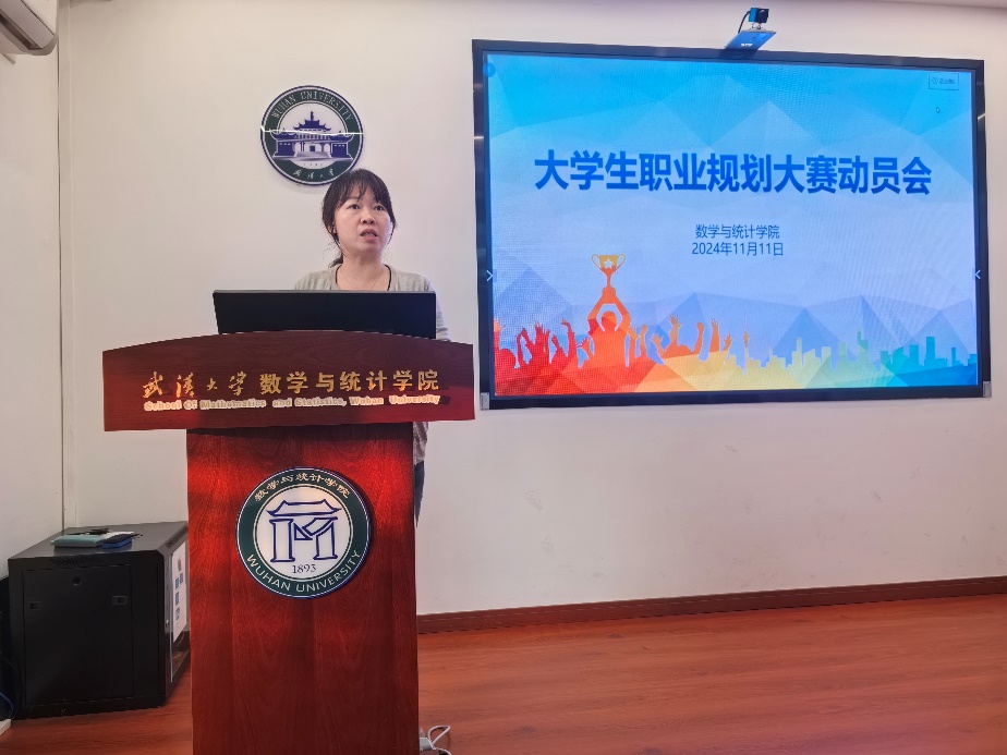 2024年11月11号下午,数学与统计学院举办全国大学生职业规划大赛动员大会。参加会议的嘉宾有就业指导与咨询办公室主任王丹,学院党委副书记刘珊珊,本科生辅导员谈华敏,文学院22级本科生徐敬娴,会议由学生工作办公室主任胡法拉主持,学院部分本科生和研究生参加了本次会议。