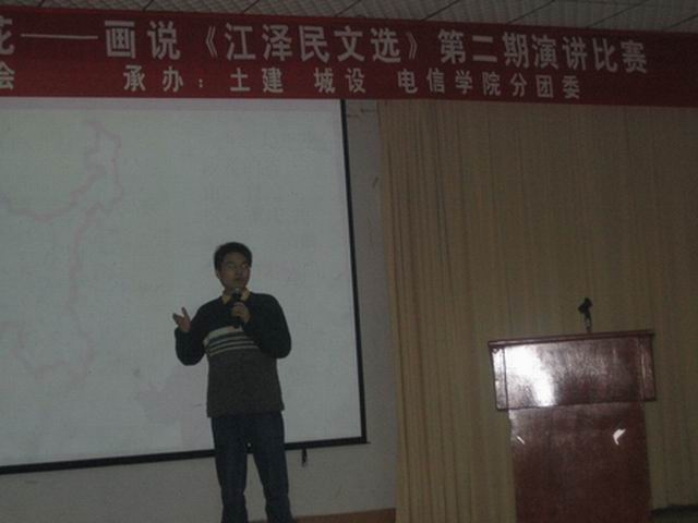 十二月六日晚上七时许,武水大学生活动中心人声鼎沸热闹非凡,在这里开展了由校团委、校团副联席会主办的"图现文选精髓 激荡思想火花"--画说《江泽民文选》第二期演讲比赛,来自十四个院系的十七位选手指点江山慷慨陈词.在精彩的演讲中,大家加深了对《江泽民文选》的认识。其中,成人导航 05级数类二团支部杨升同学关于西部大开发的演讲以84.00分的好成绩获得第七名,并最终荣获三等奖。