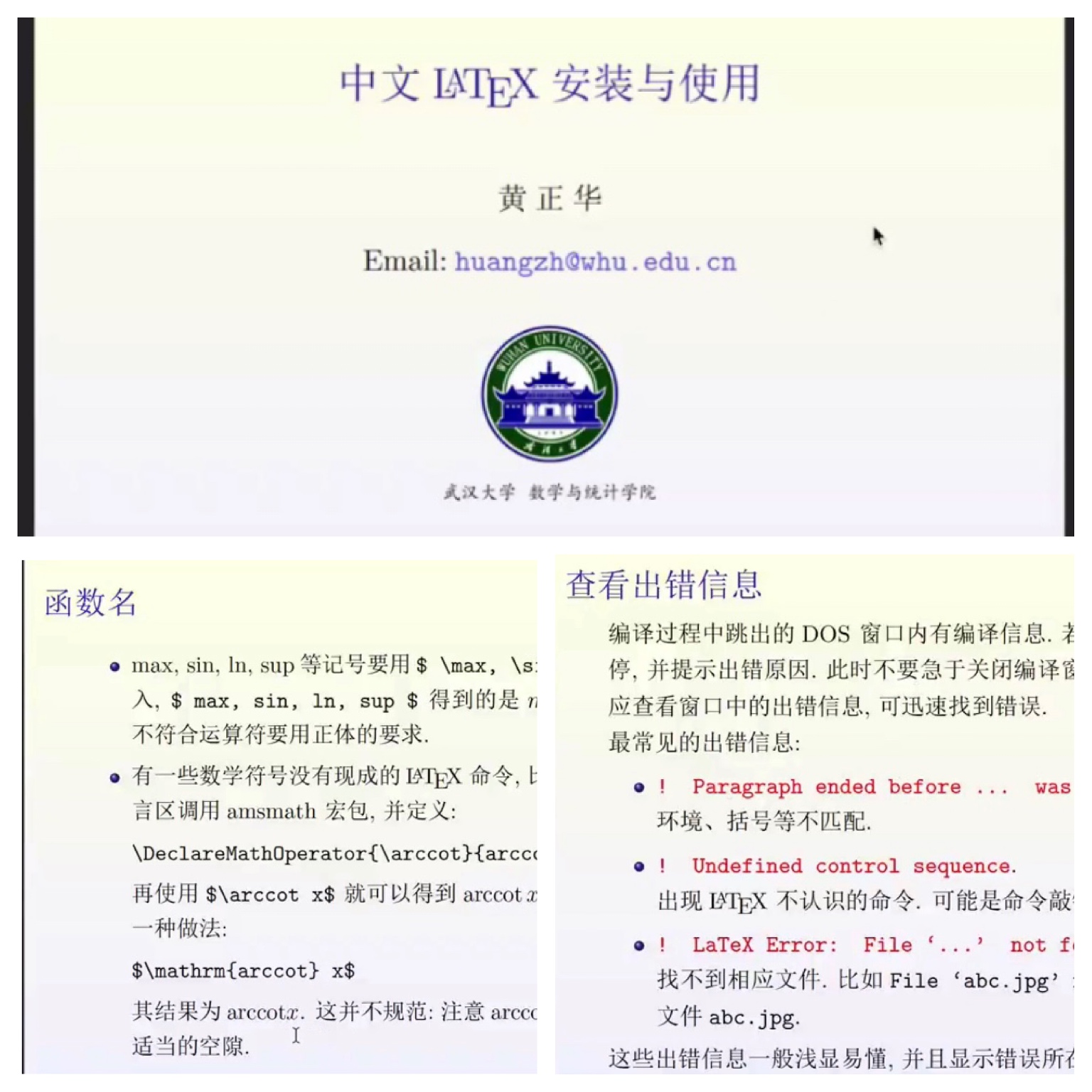 讲座第二部分,黄老师讲解了如何利用Beamer制作幻灯片,具体参考了Ki-Joo Kim于2004年编写的《Beamer v3.0 Guide》。同时,黄老师建议同学们在制作数学专业相关的幻灯片时尽量保证其素雅的特点,避免引入过多元素影响观众对幻灯片内容的关注度。