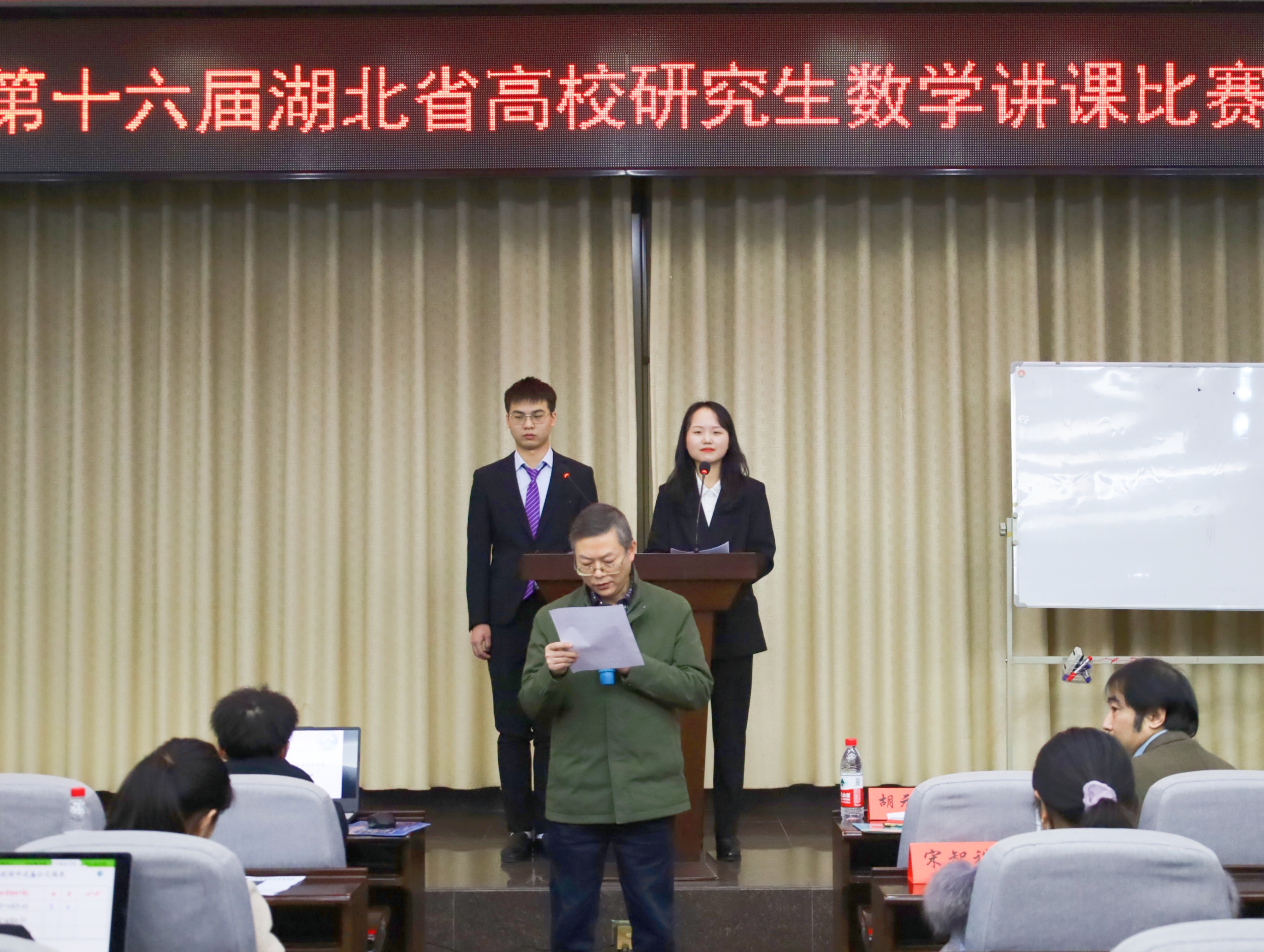 为加强我省研究生讲课的技能、提高我省研究生运用所学知识开展教育教学的能力以及为未来可能走向教师工作岗位的同学提供一个良好的平台,2021年12月10日晚6点整,第十六届湖北省高校研究生数学讲课比赛在数学与统计学院的数学会堂举行。