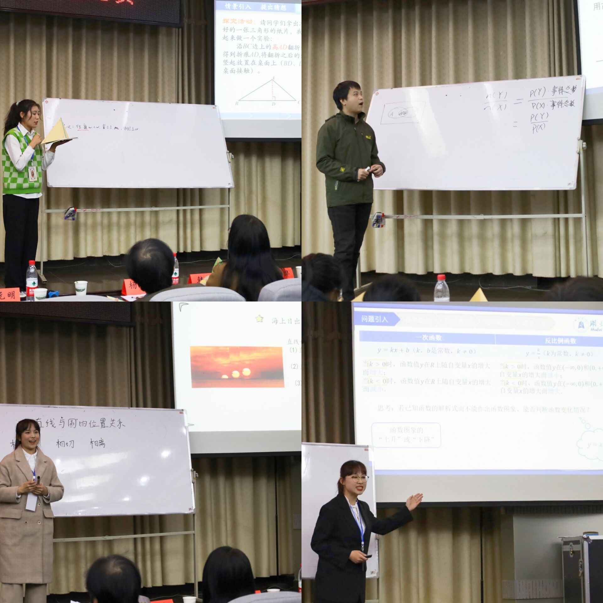参赛选手们准备充分,按抽签顺序依次进行了精彩的讲授。选手们讲课的内容广泛,涵盖了中学数学的许多重要知识点,如平面与平面平行的判定定理,直线与平面平行的判定定理,正弦定理,平方差公式,椭圆及其它圆锥曲线,等差数列,余弦定理,直线与平面垂直的判定定理,条件概率,直线与圆的位置关系,函数的单调关系等。